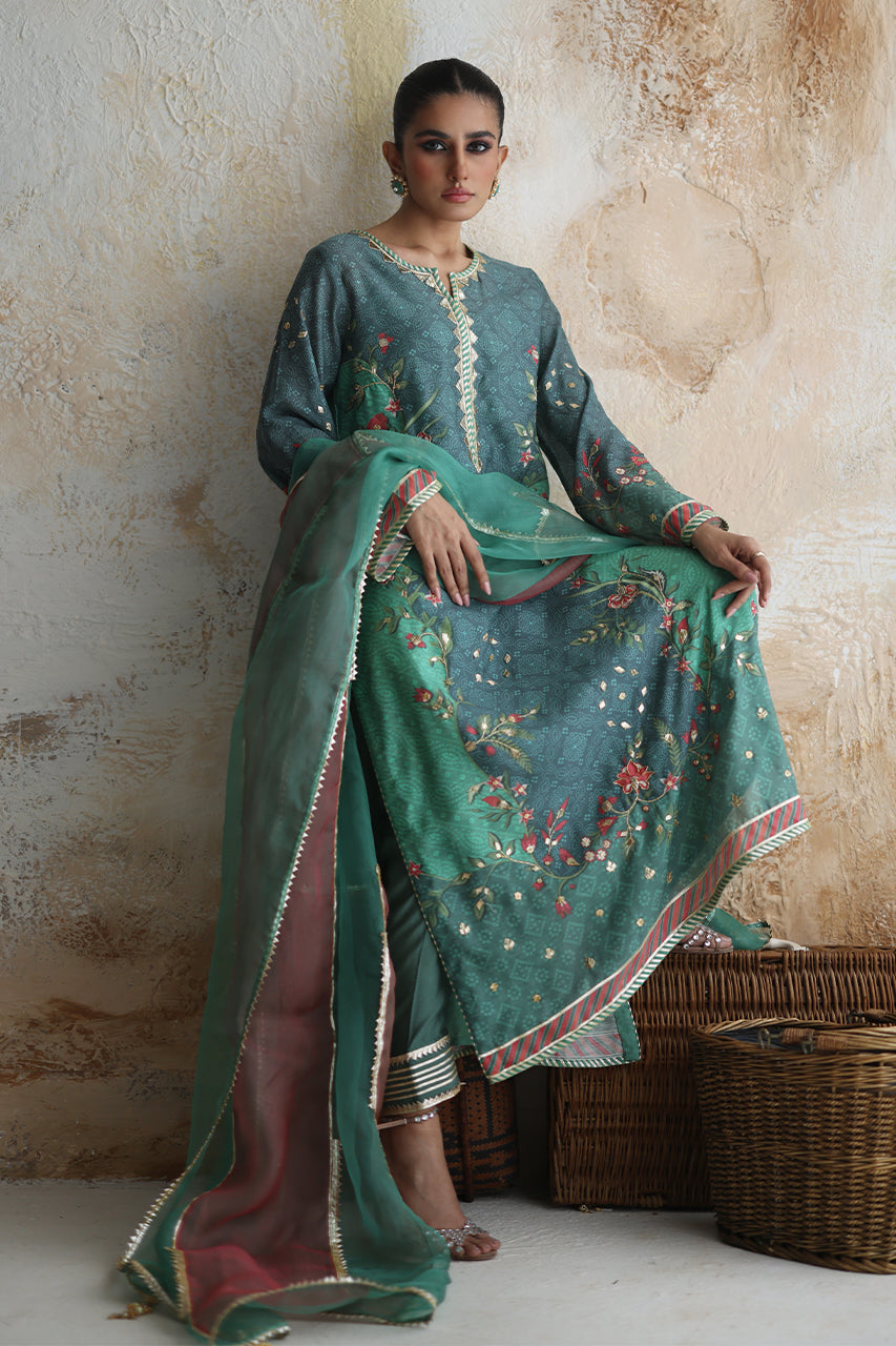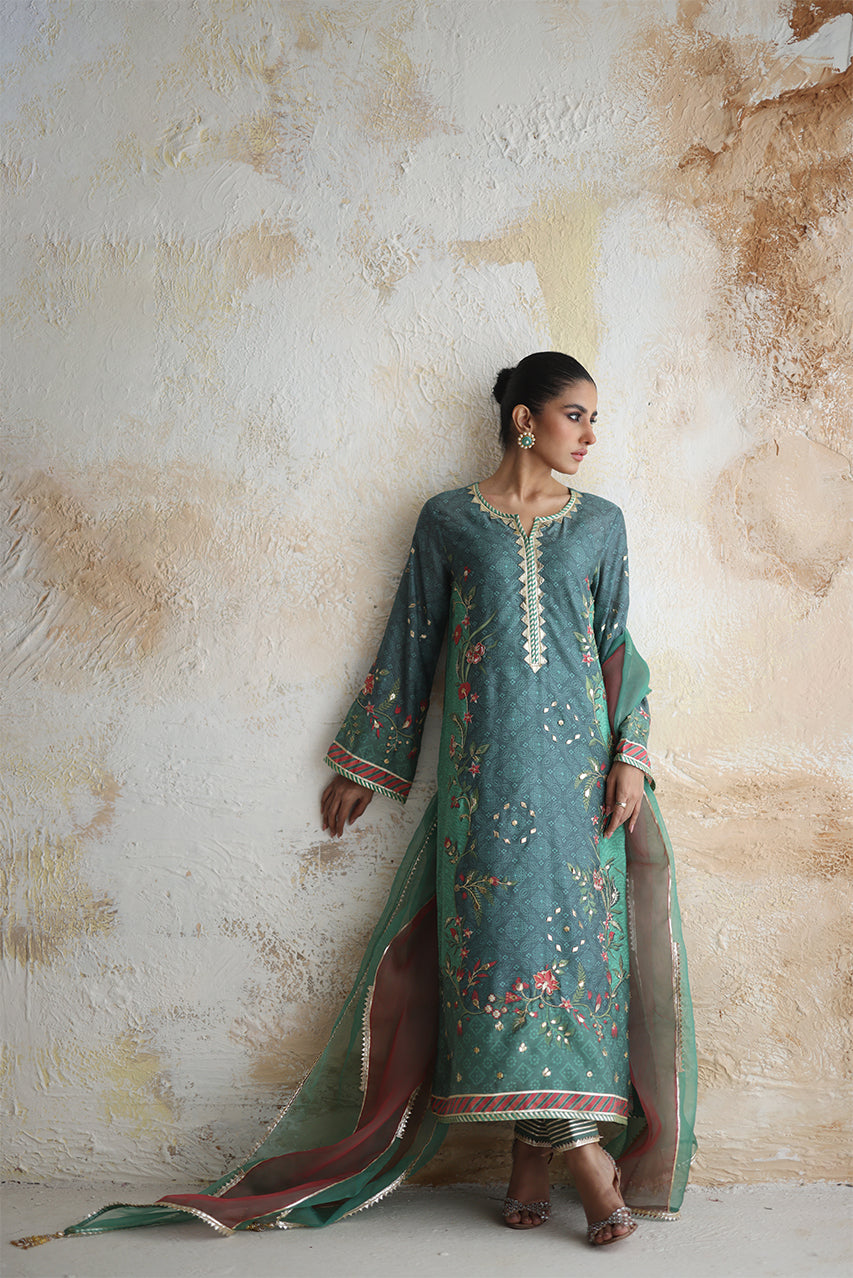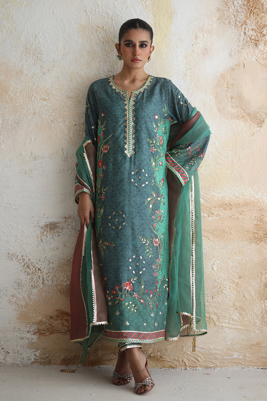 Embrace the romance of the festive season with an equally alluring ensemble. A floral print on a regal palette is intricately highlighted with gotta and zardoze details on a teal shirt cut from khaadi silk!The cascading organza dupatta has shades of teals and reds and gotta detail to match the elegance of the shirt. Pair it with matching pants for a sophisticated look that says 'dholki ready'!