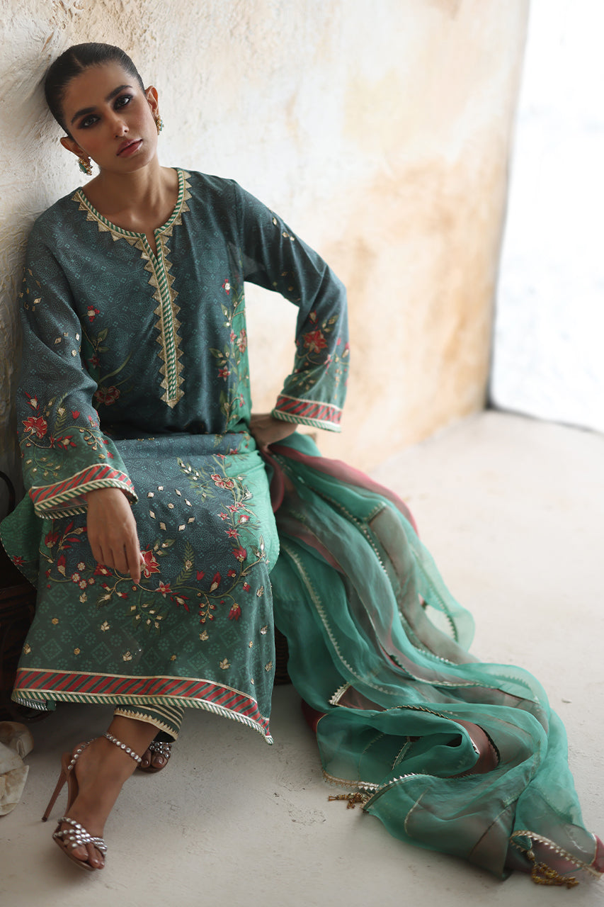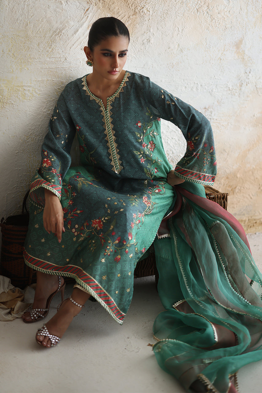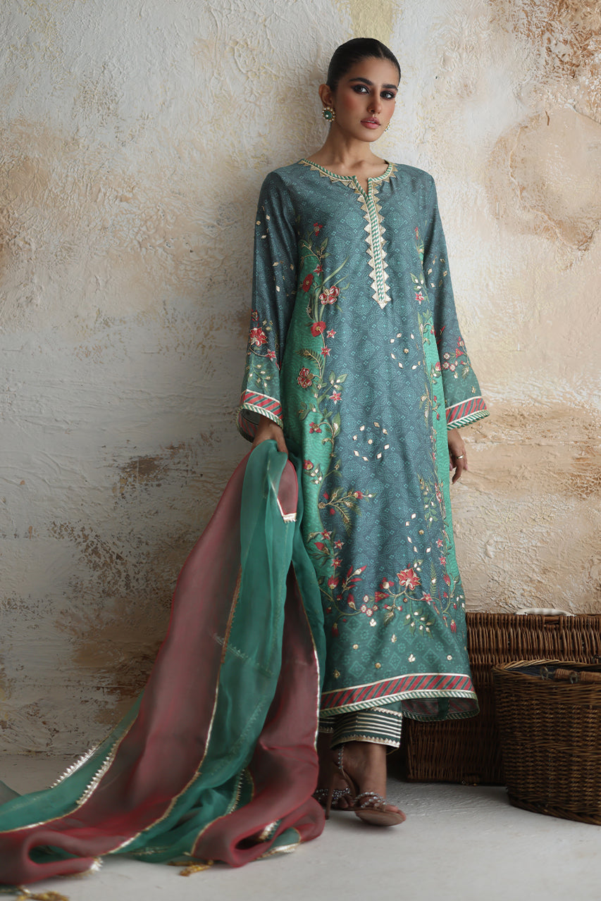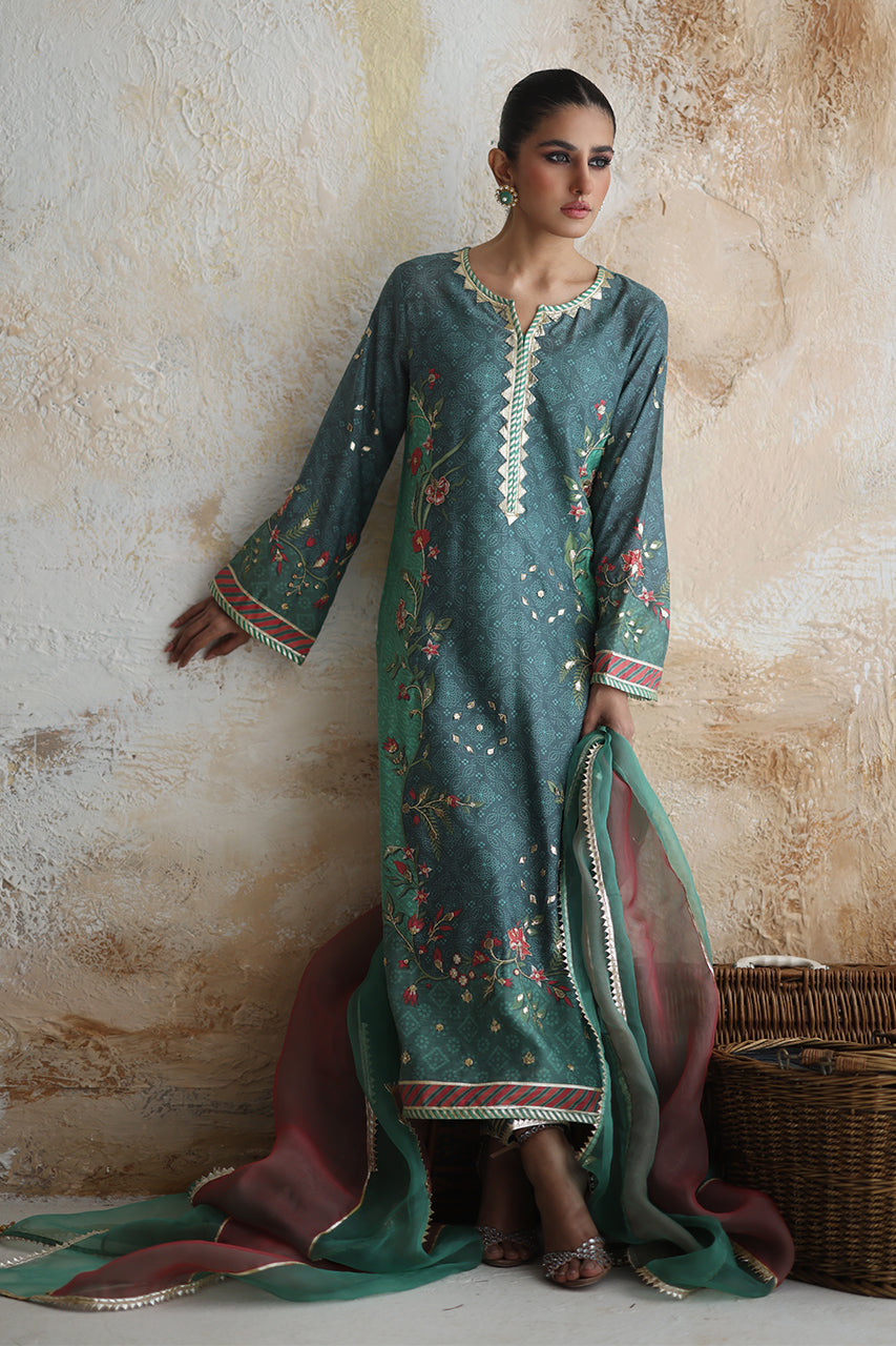 Embrace the romance of the festive season with an equally alluring ensemble. A floral print on a regal palette is intricately highlighted with gotta and zardoze details on a teal shirt cut from khaadi silk!The cascading organza dupatta has shades of teals and reds and gotta detail to match the elegance of the shirt. Pair it with matching pants for a sophisticated look that says 'dholki ready'!