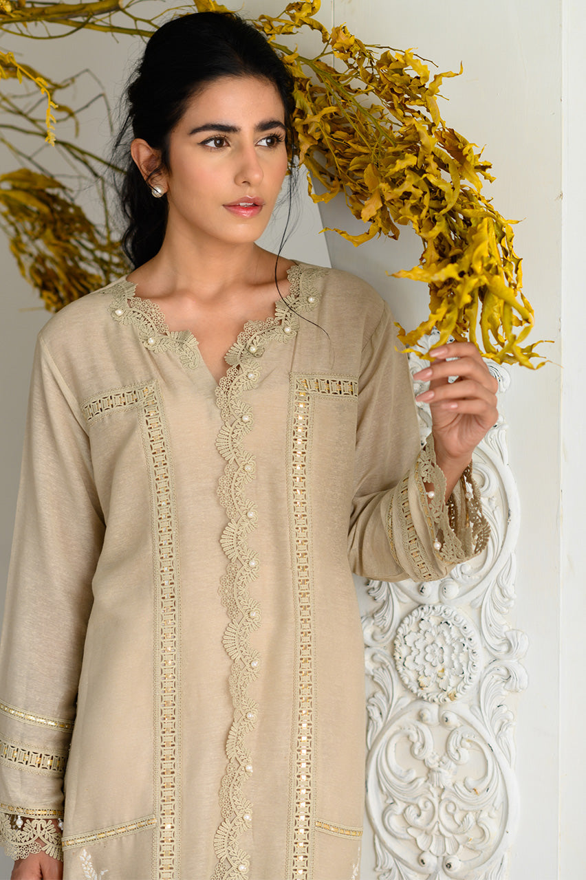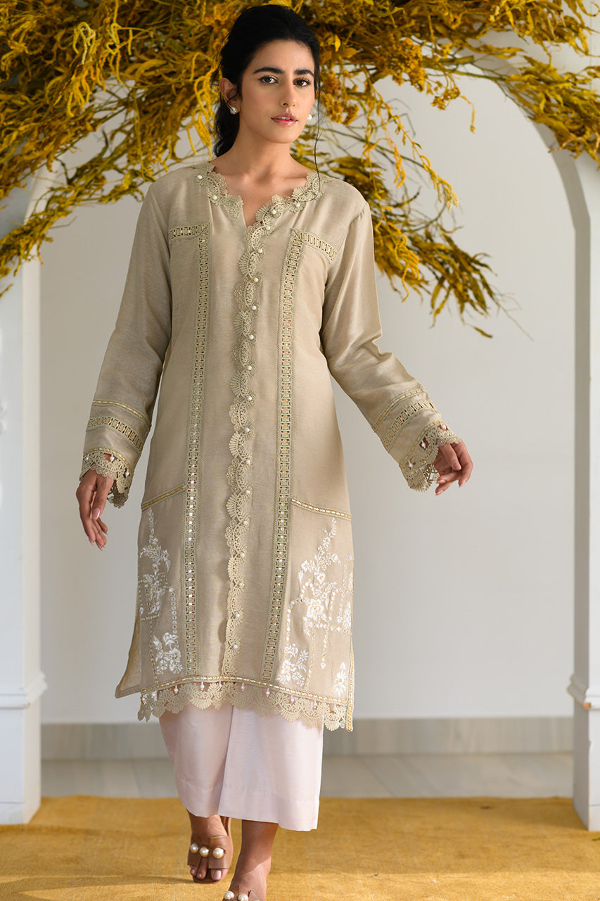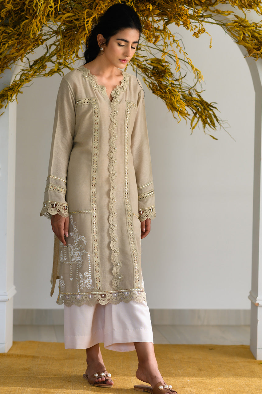 The canvas for this long karandi shirt is created with lace fillers, gotta inserts & pearl details. The resham embroidery and mirror work along the daaman complete the look. Pair it with our ivory culottes for the festive yet causal look.