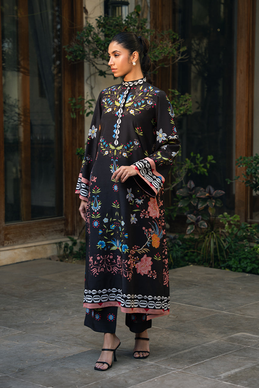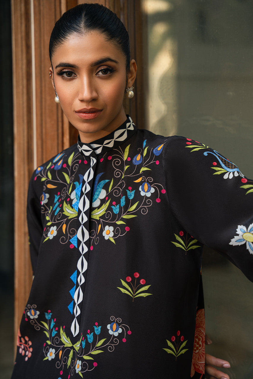 An ebony relaxed fit kurta cut from crepe features a vibrant floral painterly print. Paired with matching culottes for a complete look.