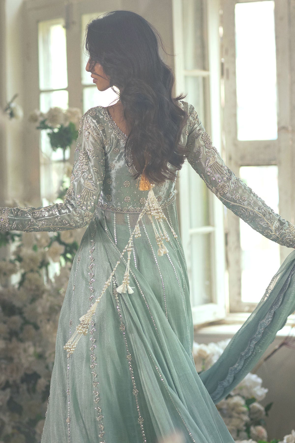 Floor-length pishwas crafted from shimmering net zari canvas in a stunning ice blue hue, embellished with intricate zardozi details in silver on the bodice and sleeves. The hem is elegantly adorned with scalloped accents. The centre back features handcrafted tassels for enhanced appeal. This pishwas is complemented by two-legged damask dhaka and a matching dupatta, which showcases delicately placed sequins that catch the light beautifully.