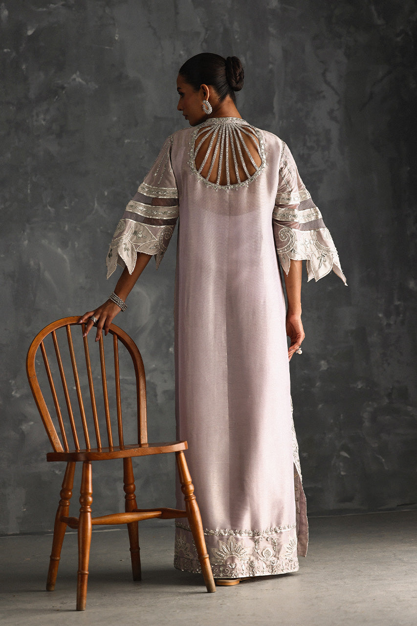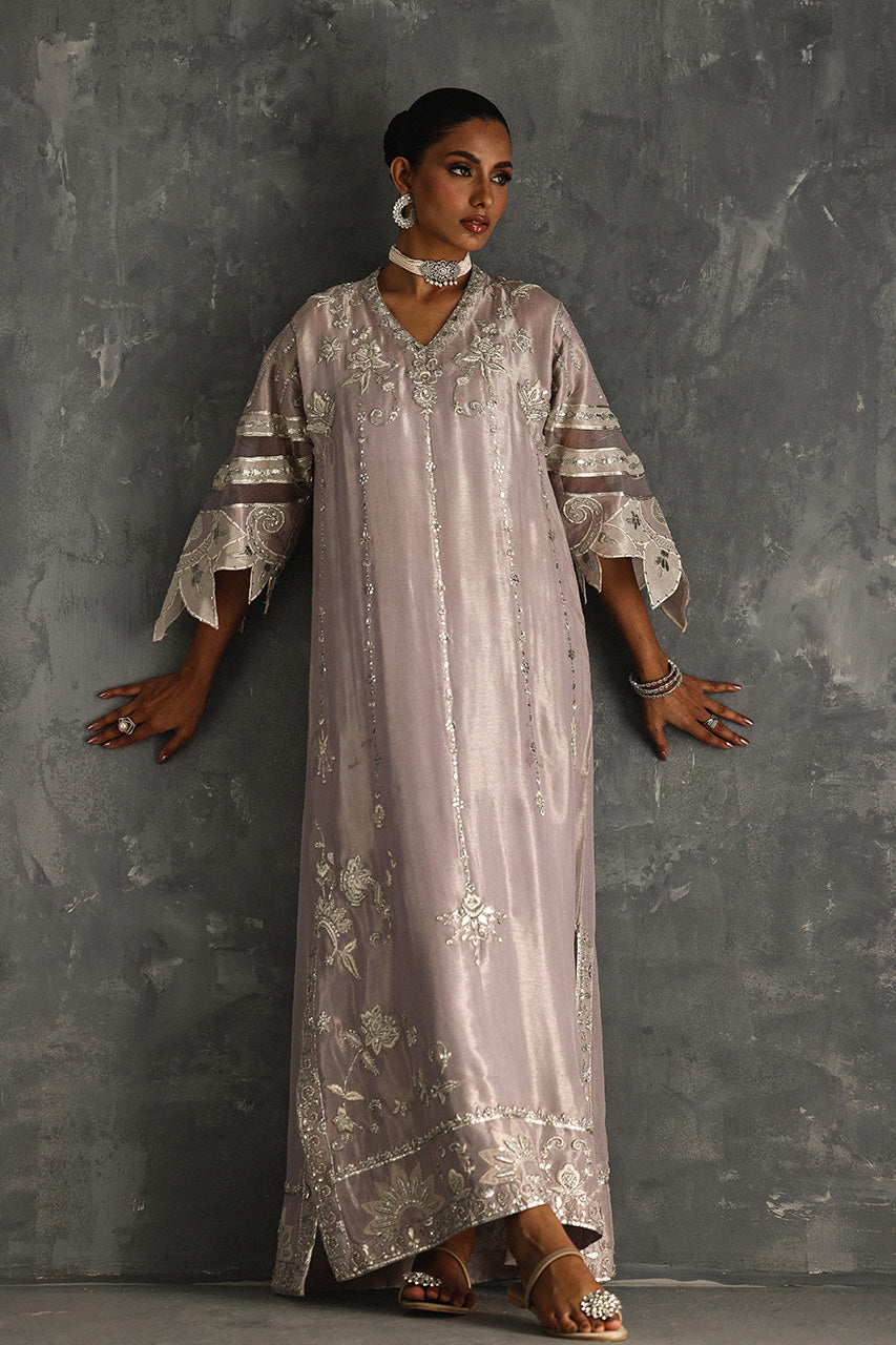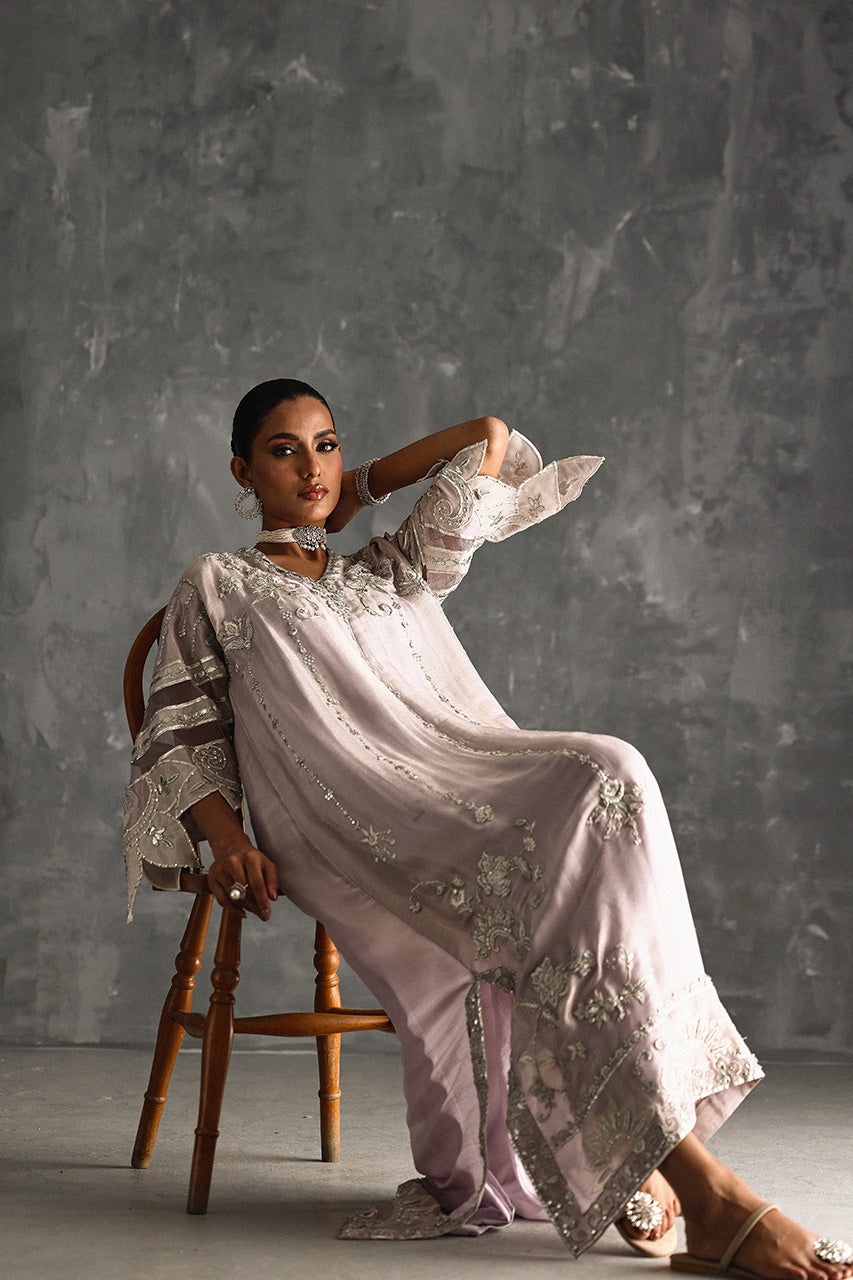 An effortless kaftaan, cut from lilac meysuri, 'Astra' showcases fine craftsmanship with resham, kamdani and zardoze embroidery. Beautifully crafted peek-a-boo organza sleeves with meysuri applique & worked in bold gotta work accentuate the look! A showstopping back with an exaggerated keyhole make this outfit an apt choice for the festive season!