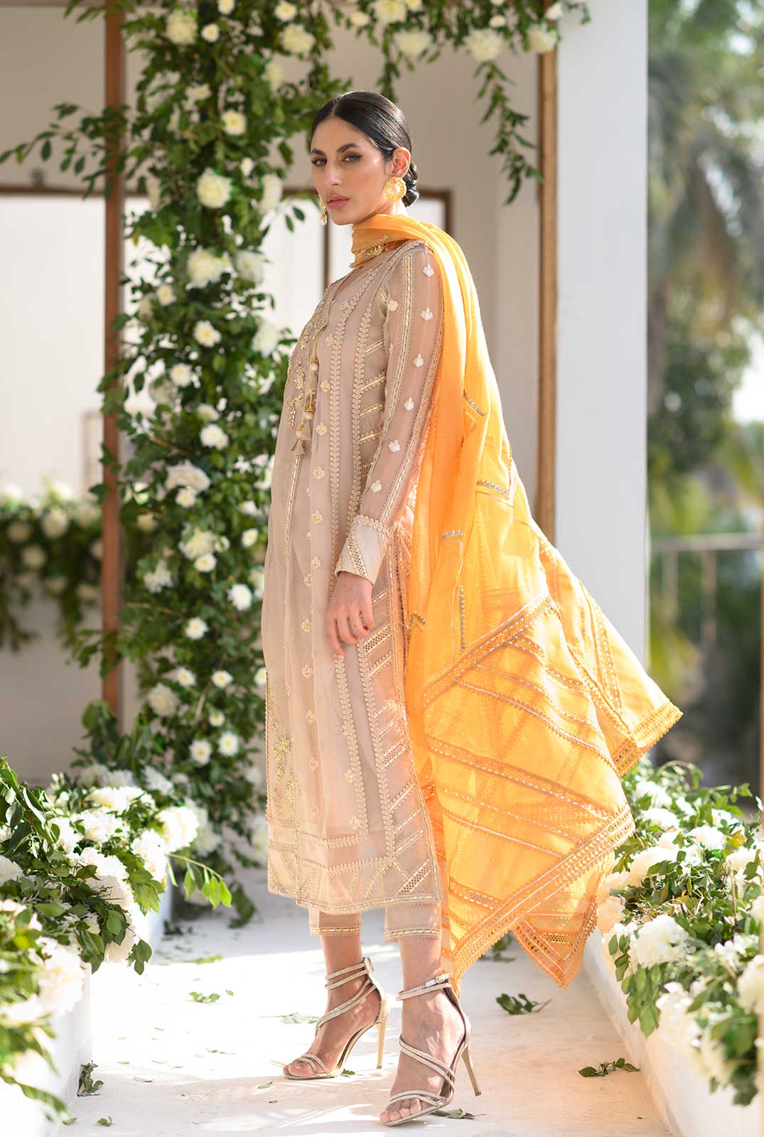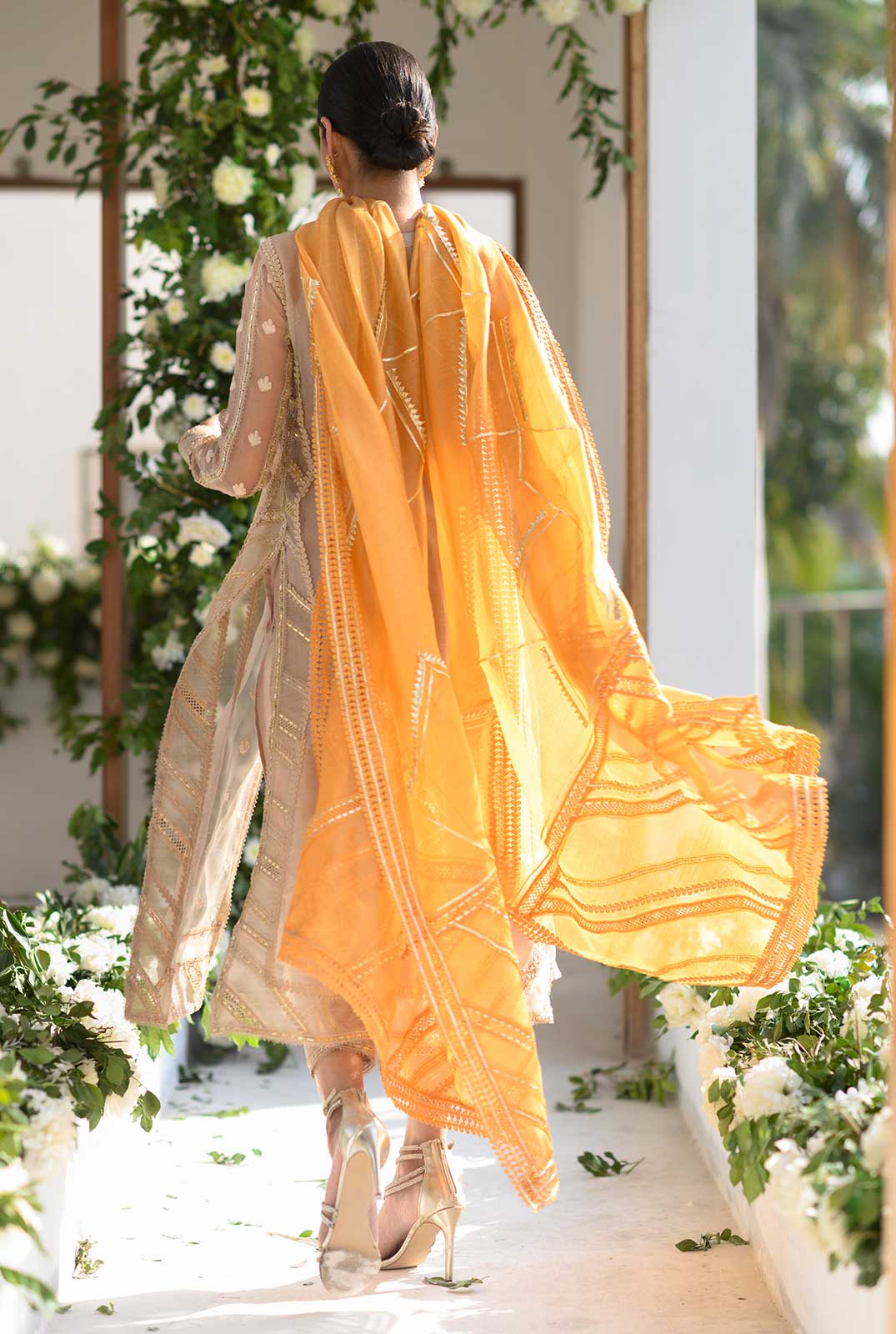 This festive angarkha is embellished with lace & gotta details along with the panels and finished with an intricately gotta worked border at the sides & daman. Pair it with poppy mustard gotta worked dupatta, this outfit will take you through mayuns, mehndi, and nikkah ceremonies.