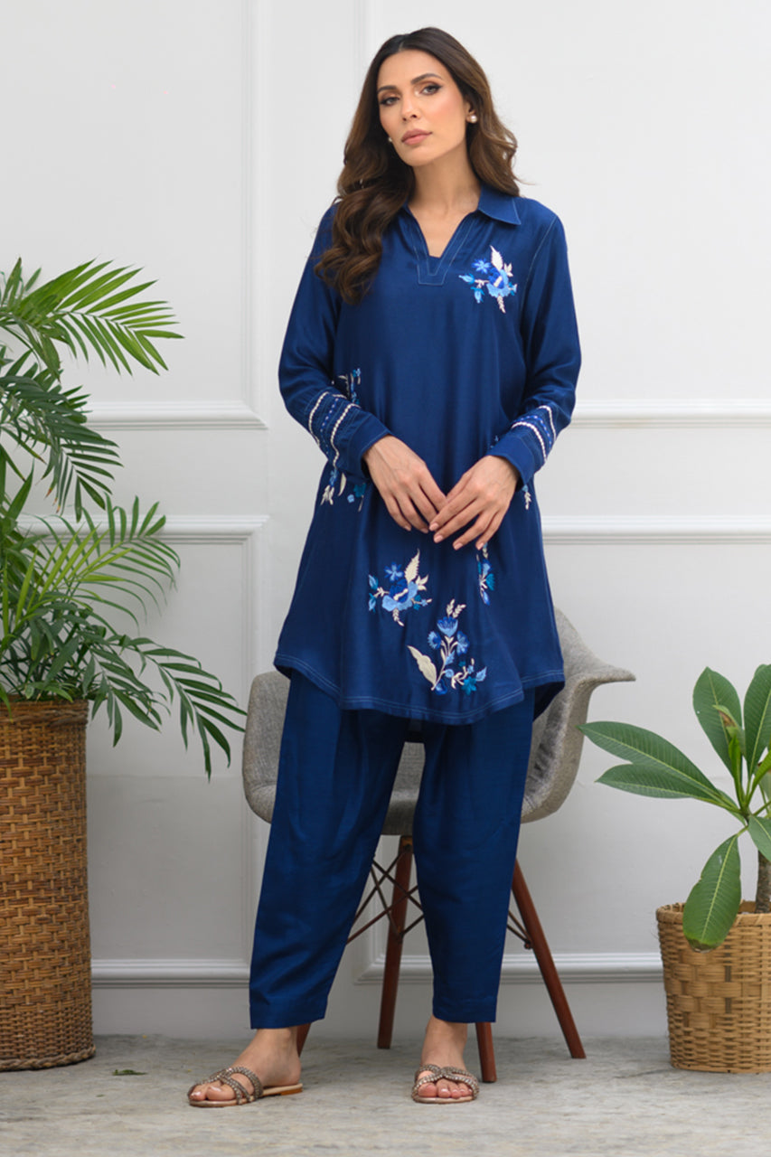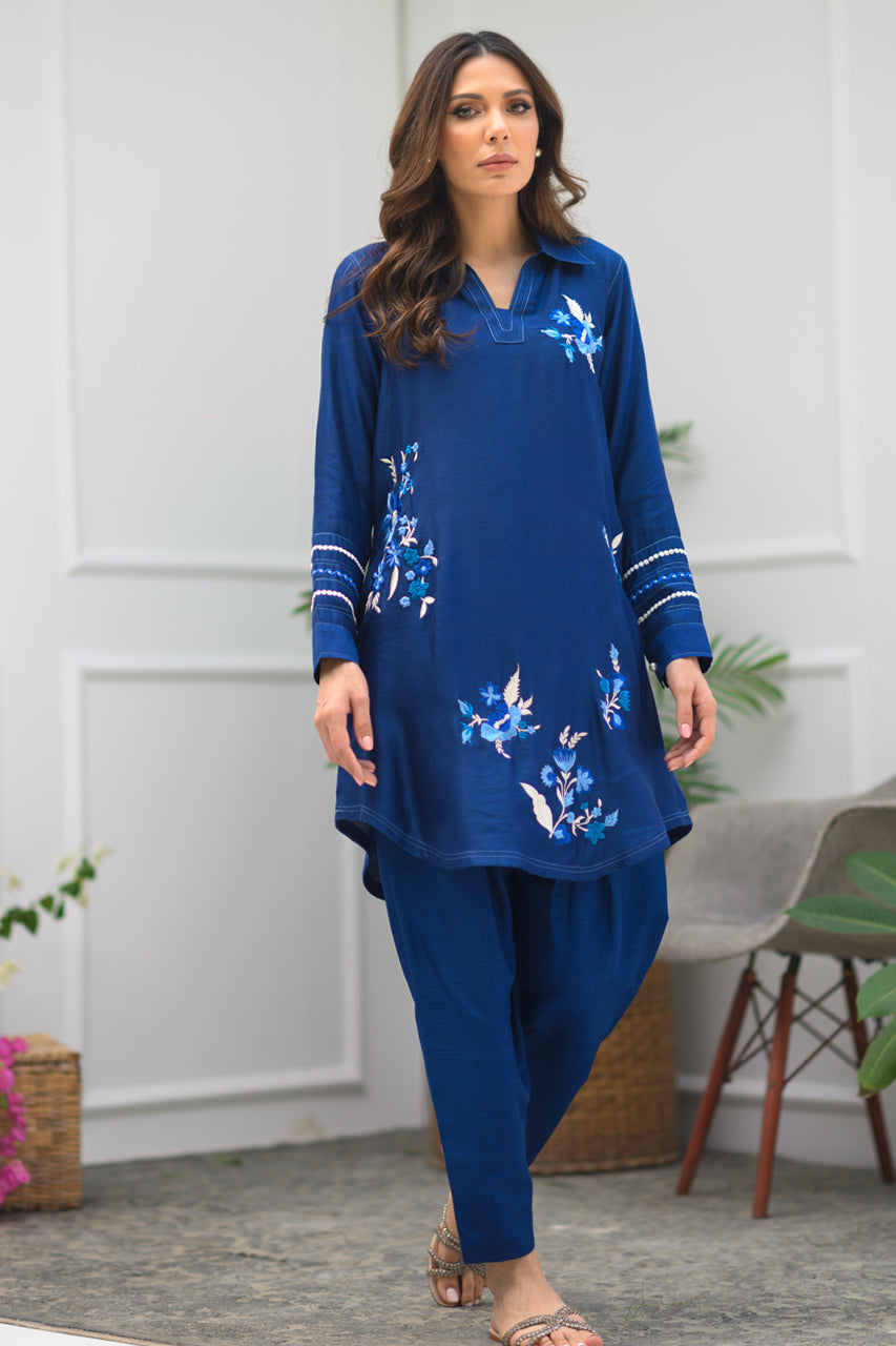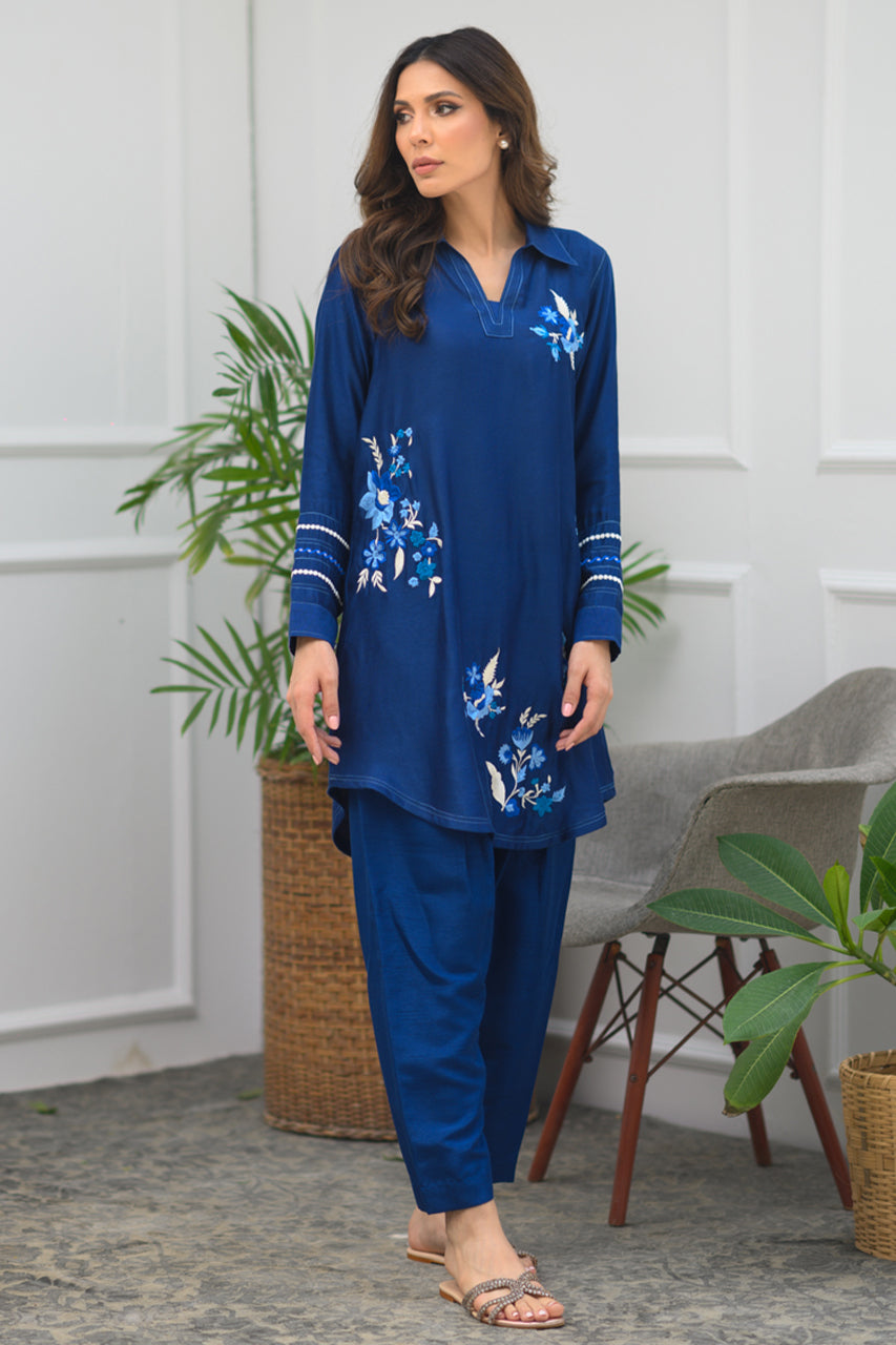 A vibrant blue for your fall/winter wardrobe. Dotted with rich resham floral blooms along the shirt front, it is paired with a tapered shalwar pant for a fun and flirty look!