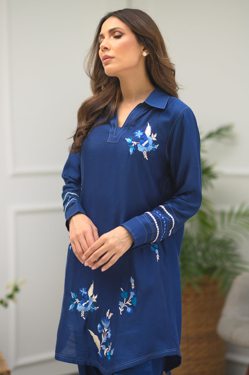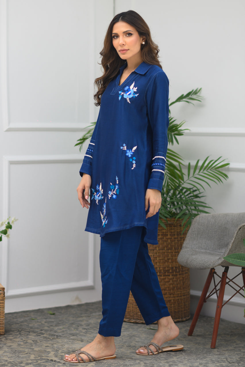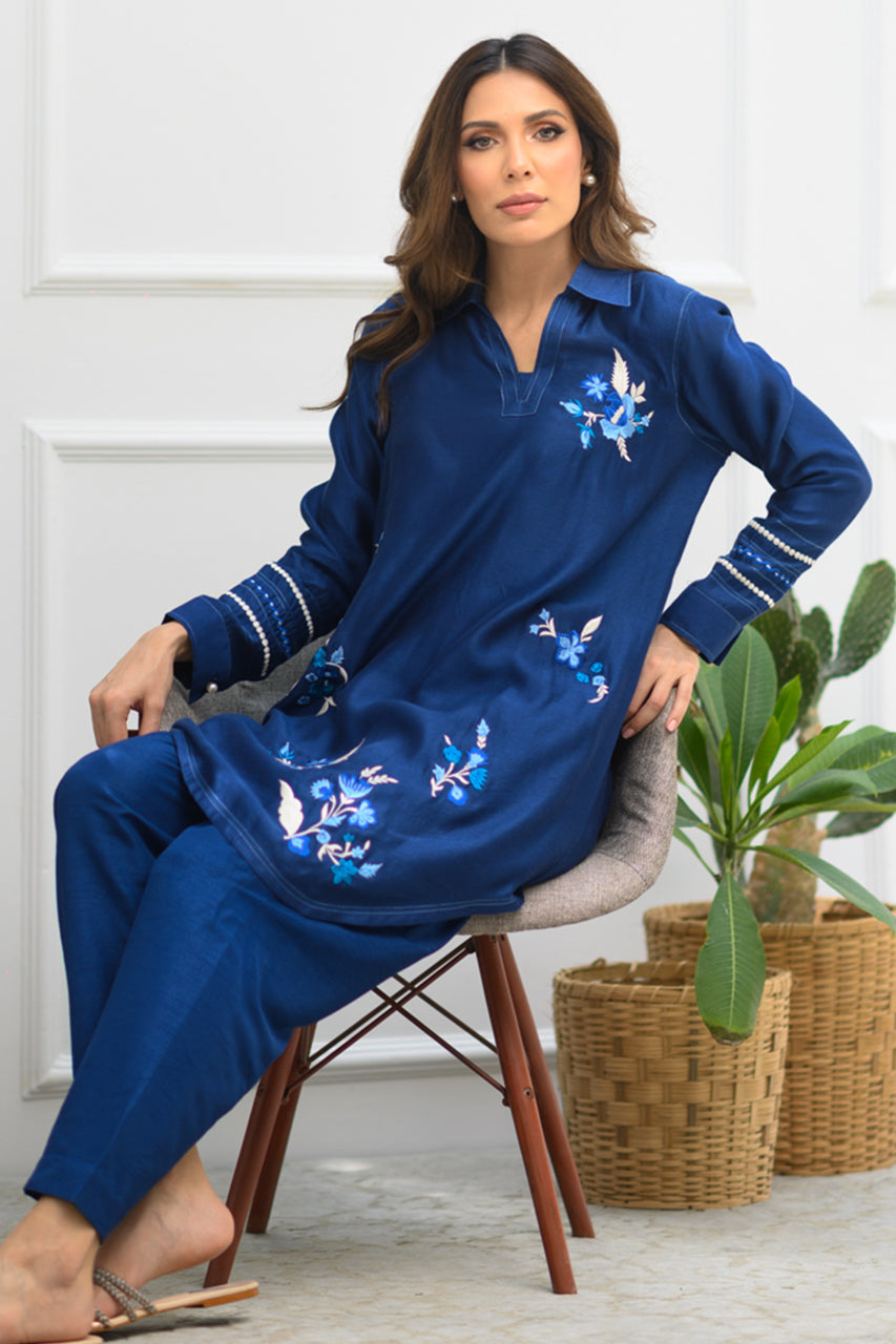 A vibrant blue for your fall/winter wardrobe. Dotted with rich resham floral blooms along the shirt front, it is paired with a tapered shalwar pant for a fun and flirty look!