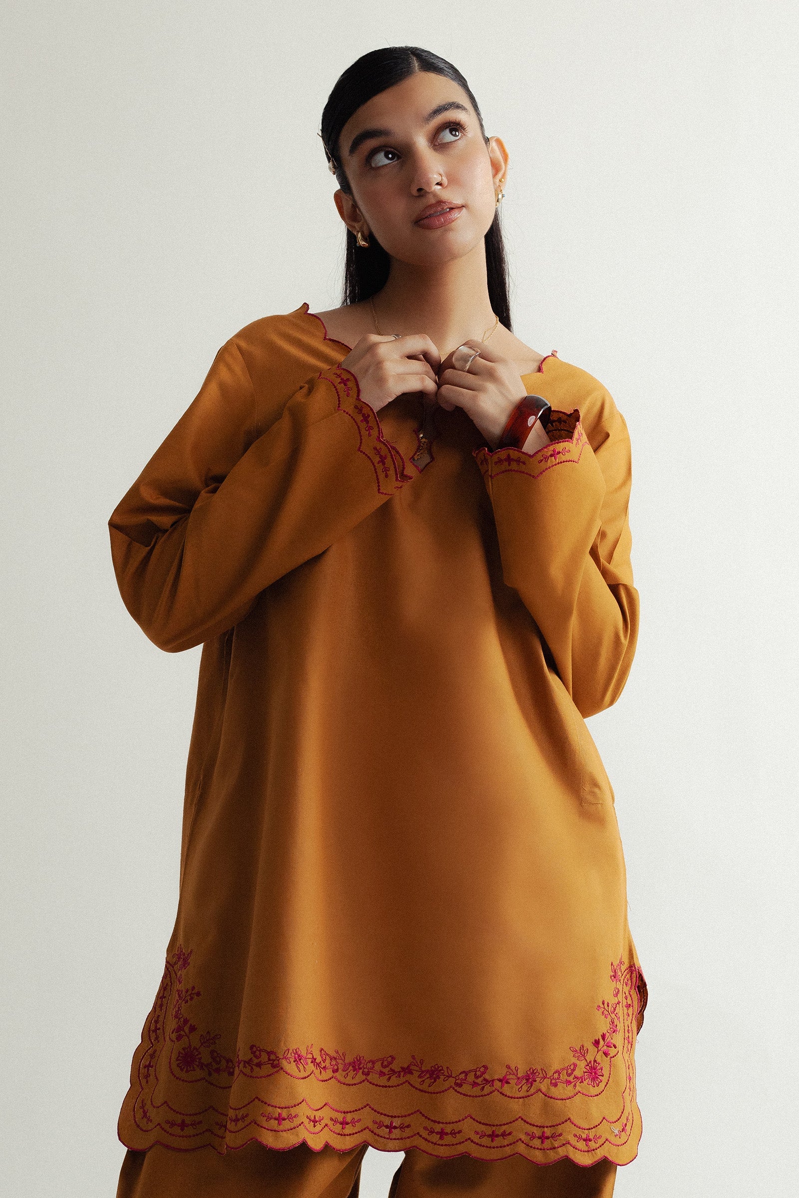 A mustard kurta with contrasting scalloped embroidery, styled with a tapered shalwar for a chic everyday look