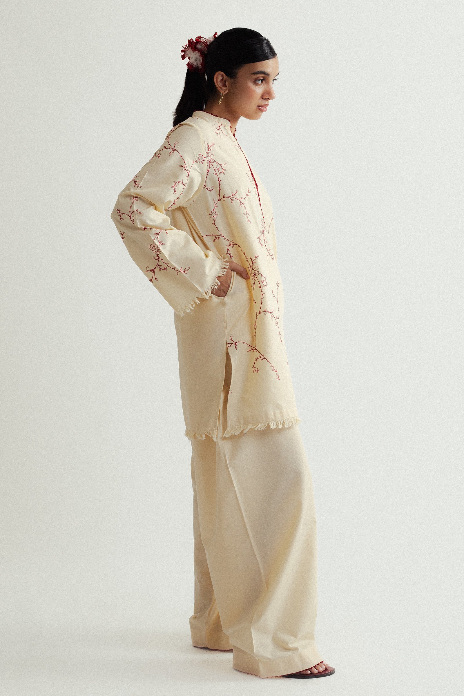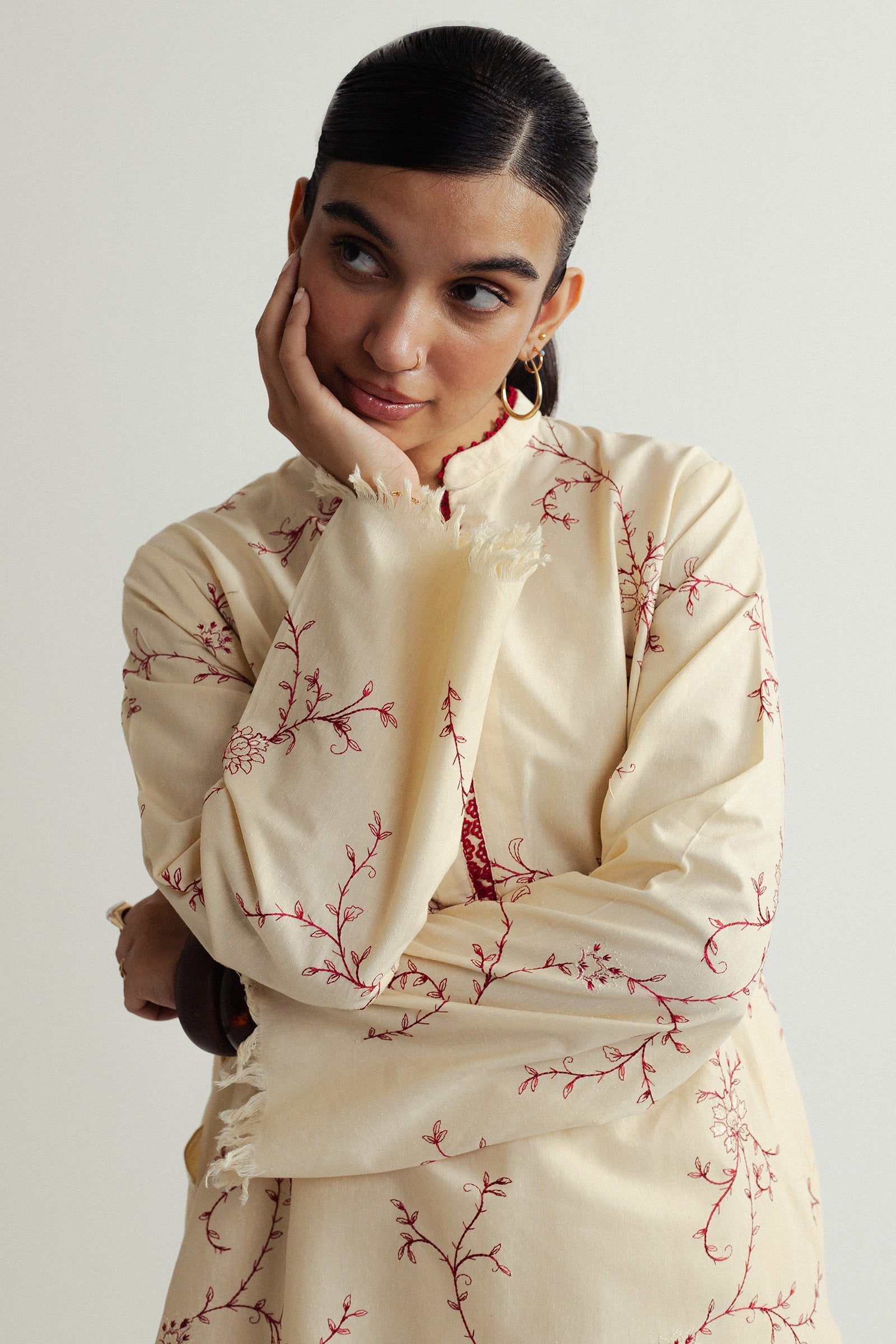 An ivory kurta with contrasting jaal embroidery all over, paired with a farshi shalwar for a classic yet striking look.
