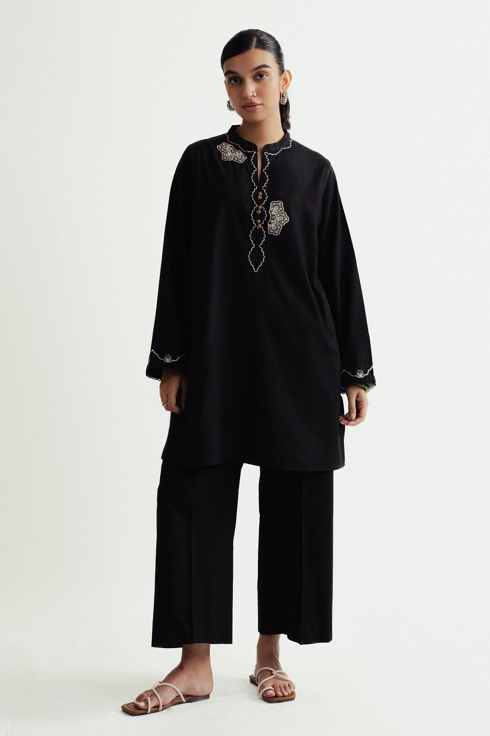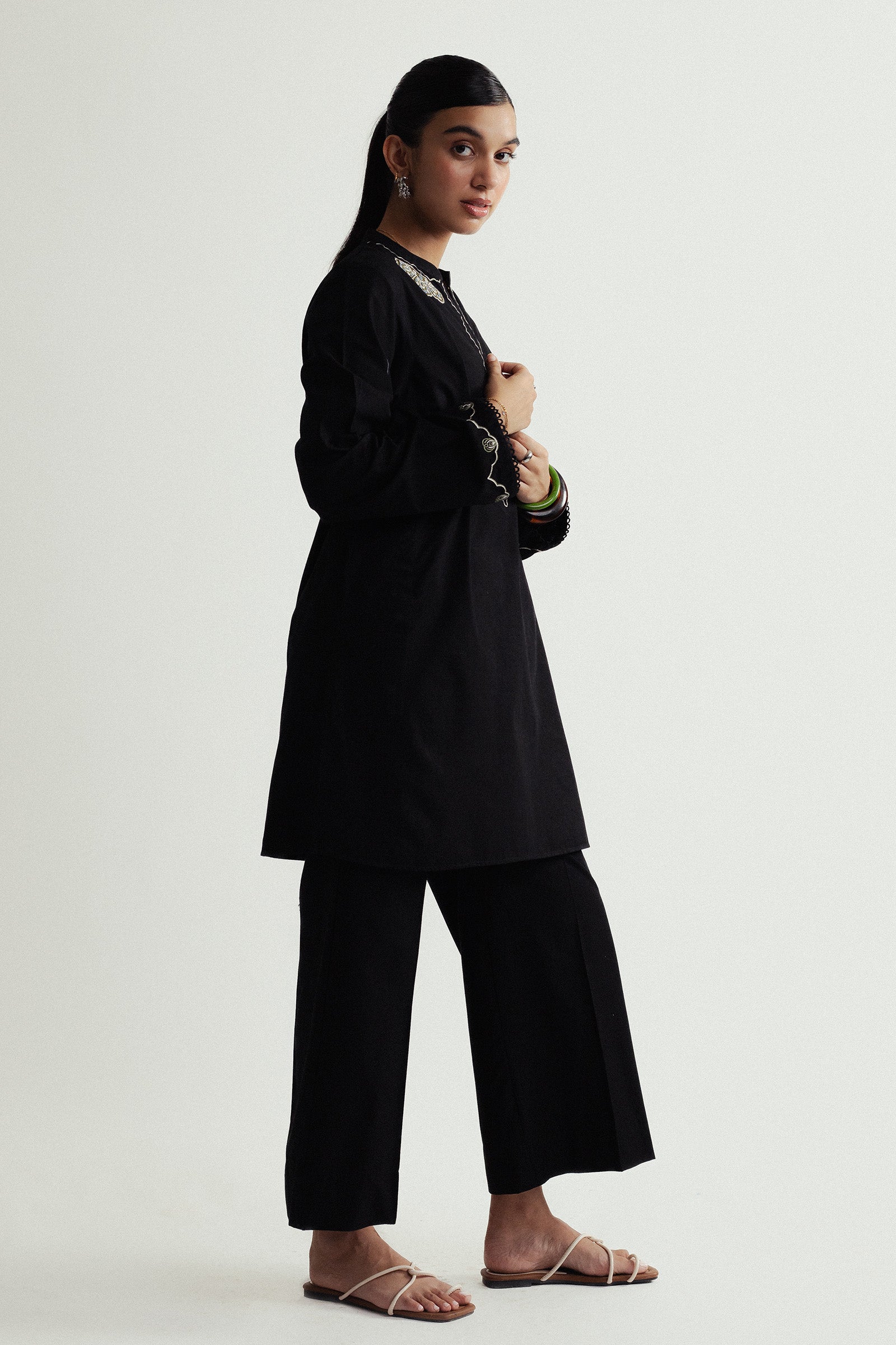 A black shirt and trouser set featuring delicate neckline embroidery with linear detailing, an organza floral patch, and intricately worked sleeves.