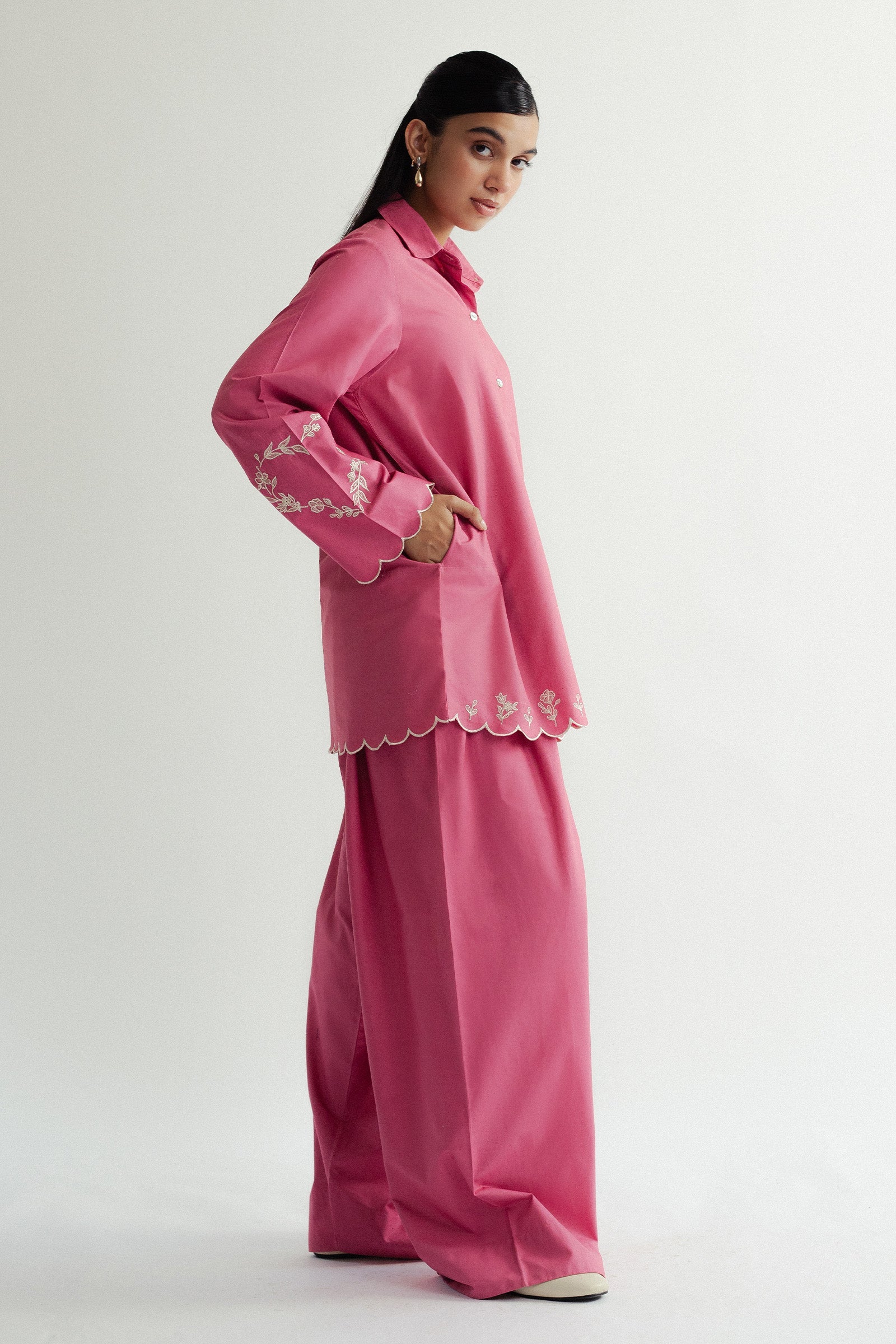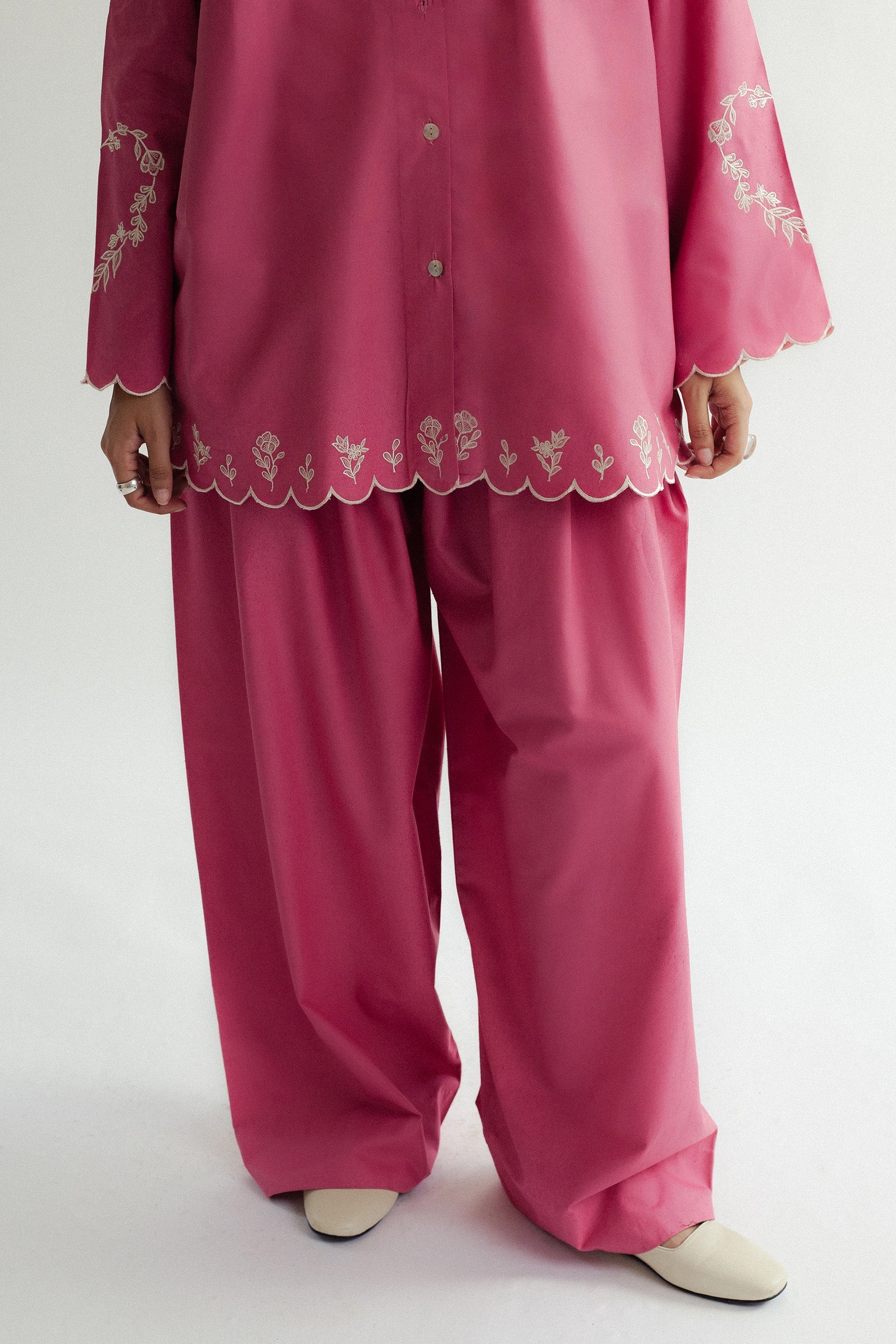 A pink button-down shirt with scalloped embroidery on the hem and sleeves, paired with a farshi shalwar for a graceful finish