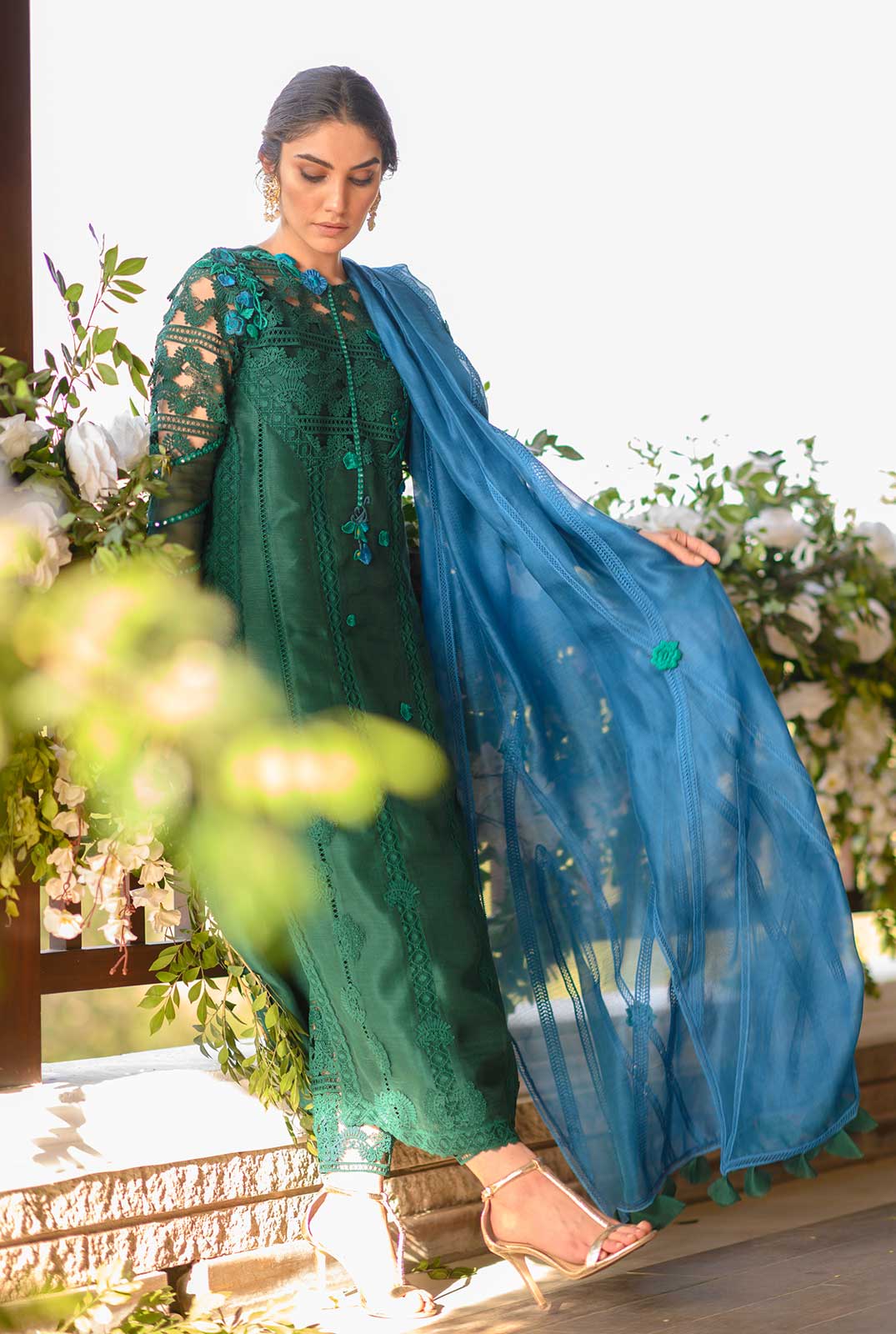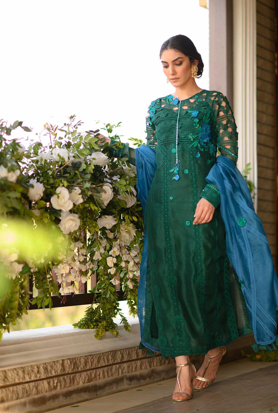 This royal bottle green shirt is impeccably detailed with laces along the front and sleeves and rendered in 3D floral motifs in hues of Blues and greens. Pair it with a contrasting electric blue dupatta with intricate florals for a perfect nighttime look!