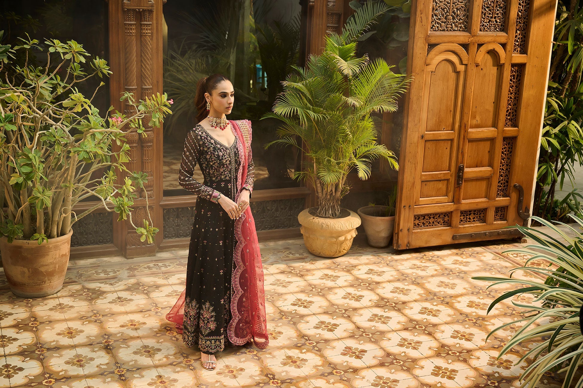 Embrace the timeless allure of Alaya with this masterpiece. The richness of black is elevated by the striking elegance of the heavily embellished frock-styled kurta, paired with straight pants. A contrasting pink dupatta is seamlessly merged with the outfit, draping gracefully and infusing vibrancy into the ensemble. Step into sophistication with this captivating creation from the Alaya collection, where black meets brilliance, and elegance meets expression.