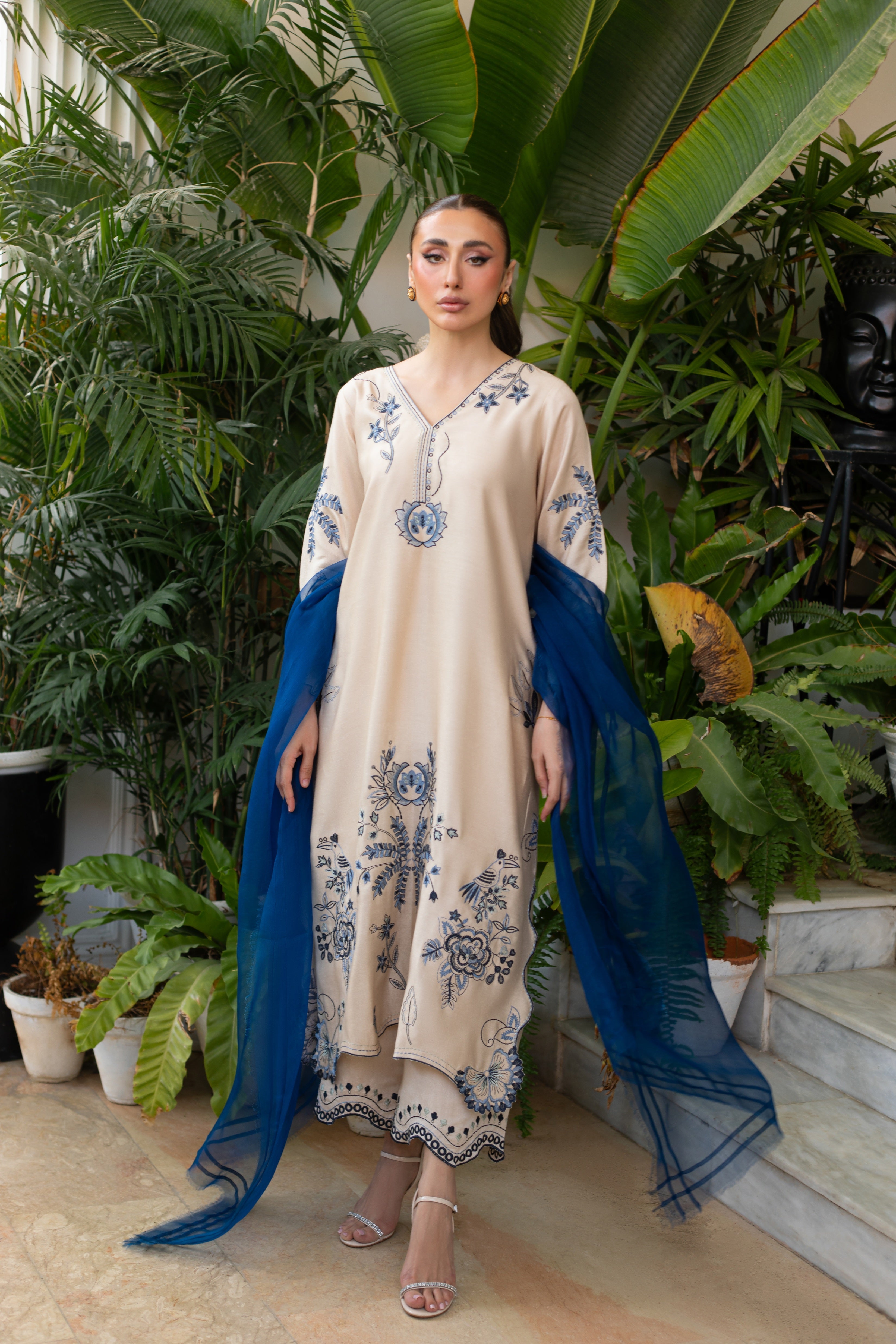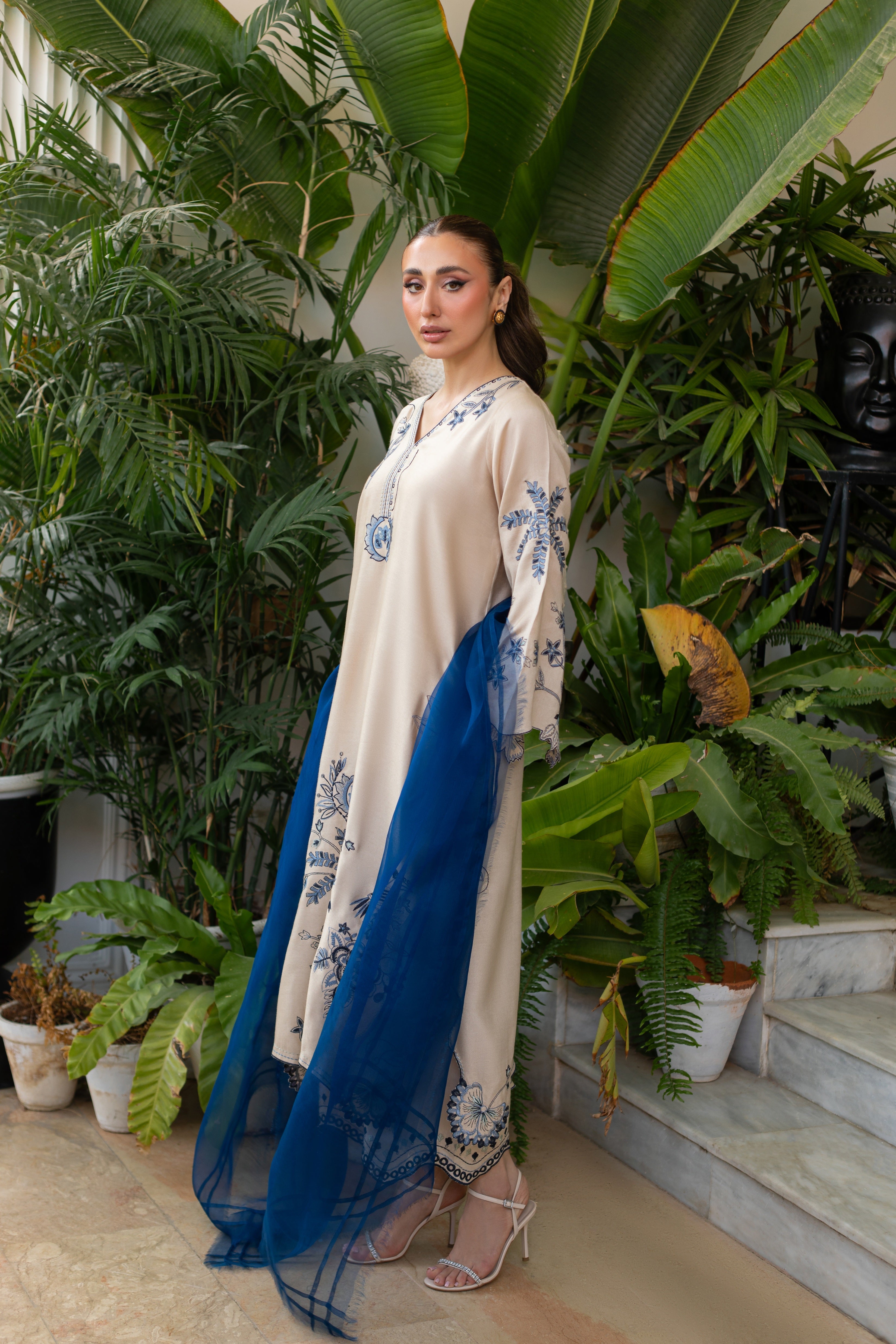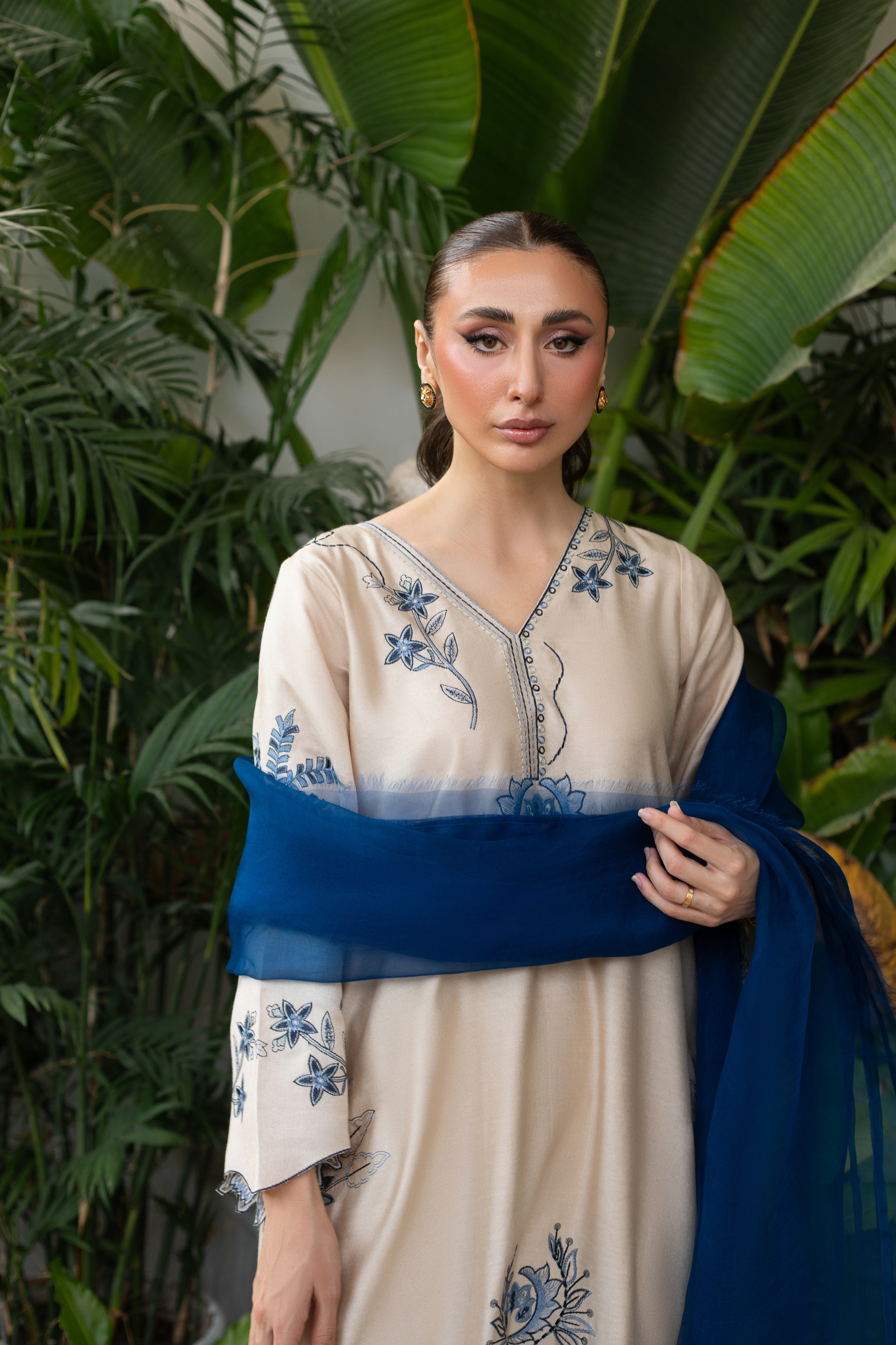 Crafted in luxurious Khaadi silk, this elegant ensemble features a soft blend of white-beige adorned with delicate blue detailing.