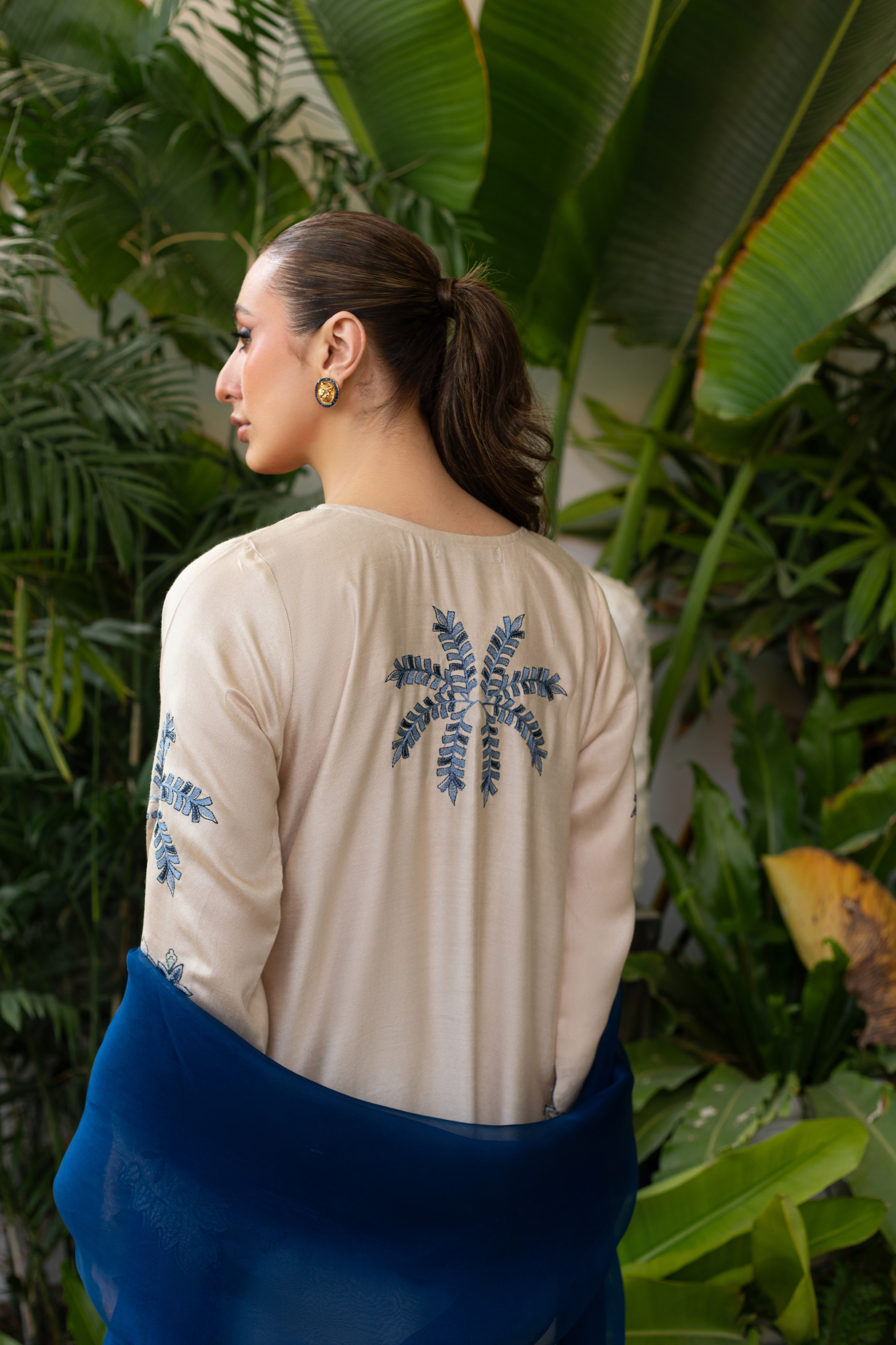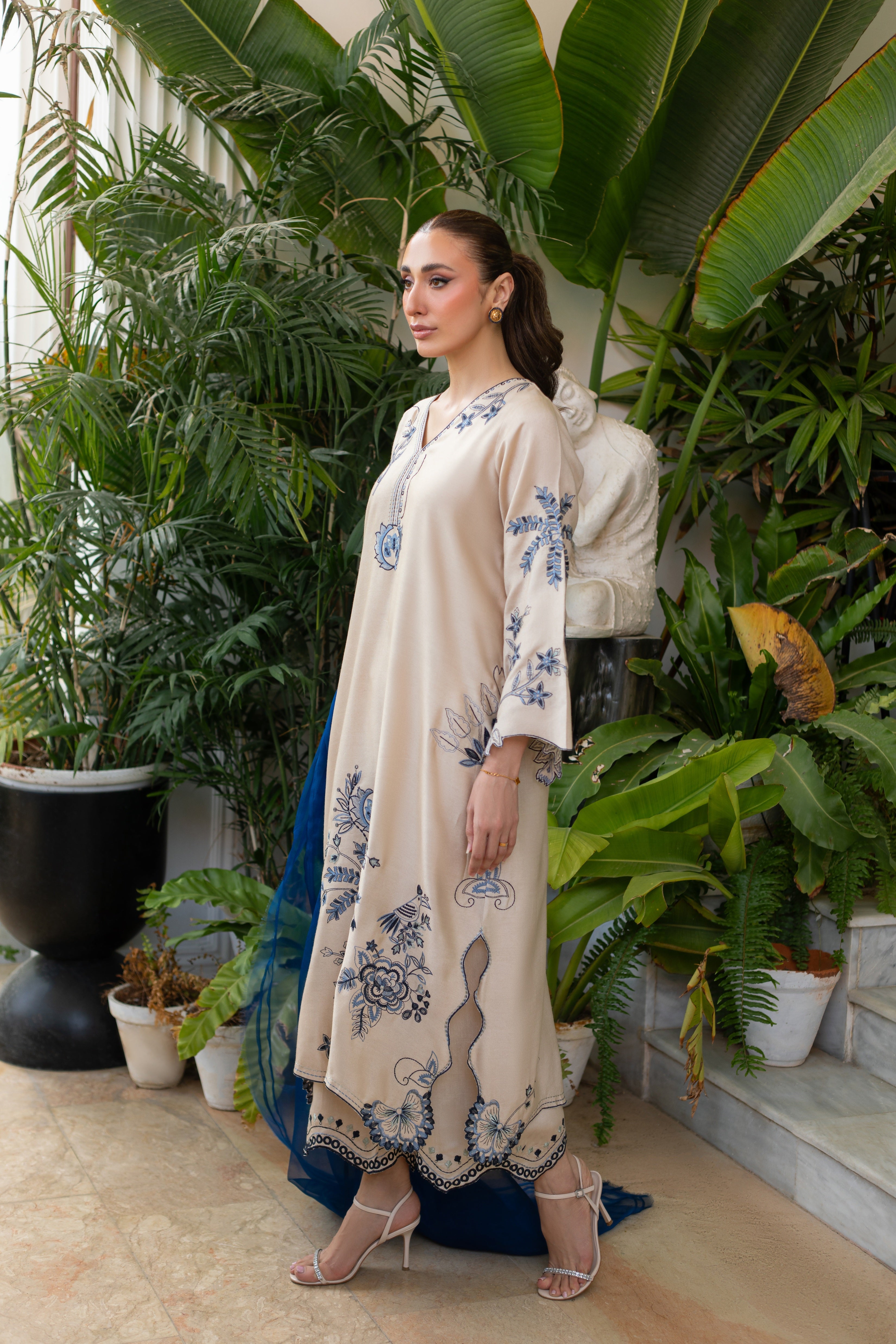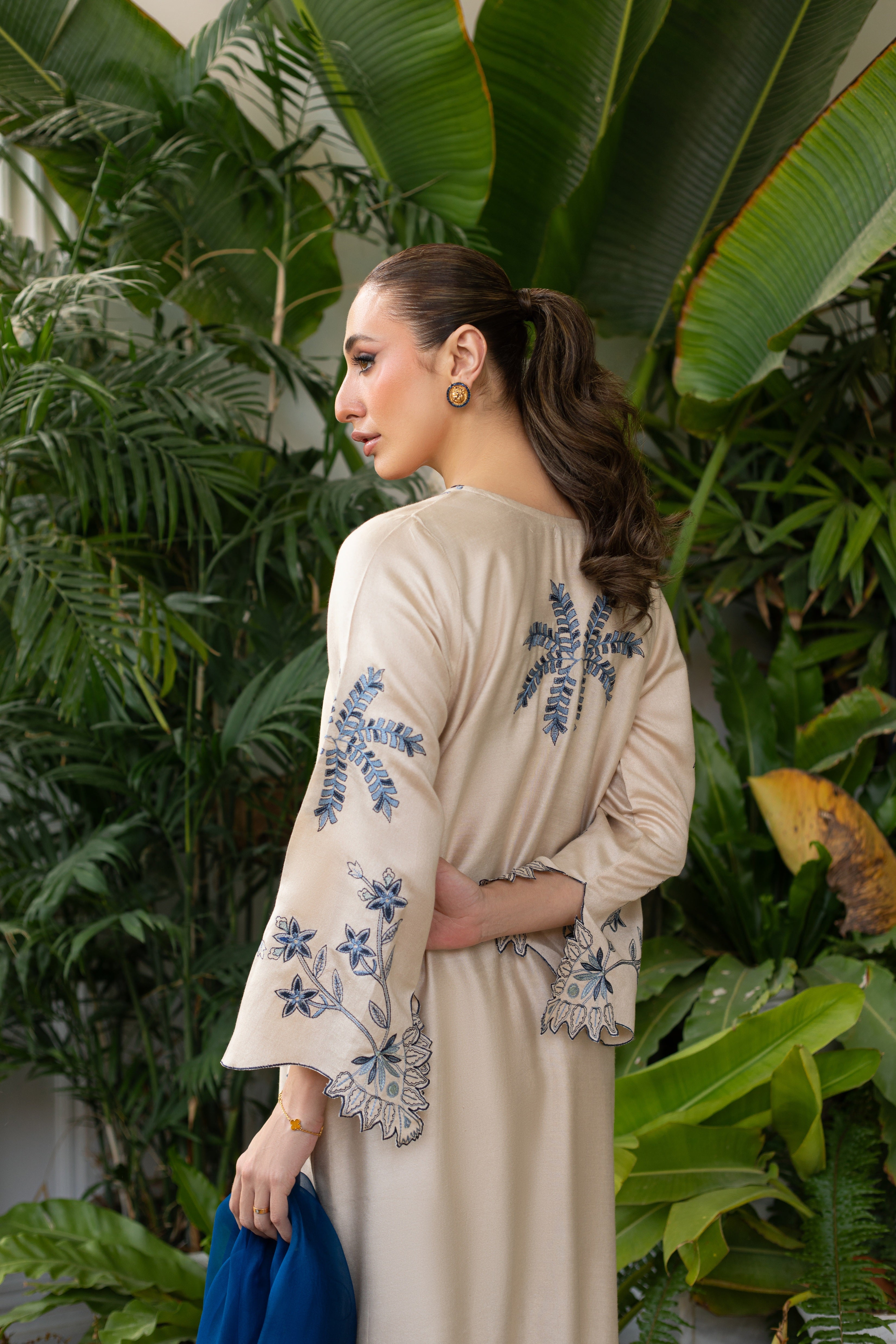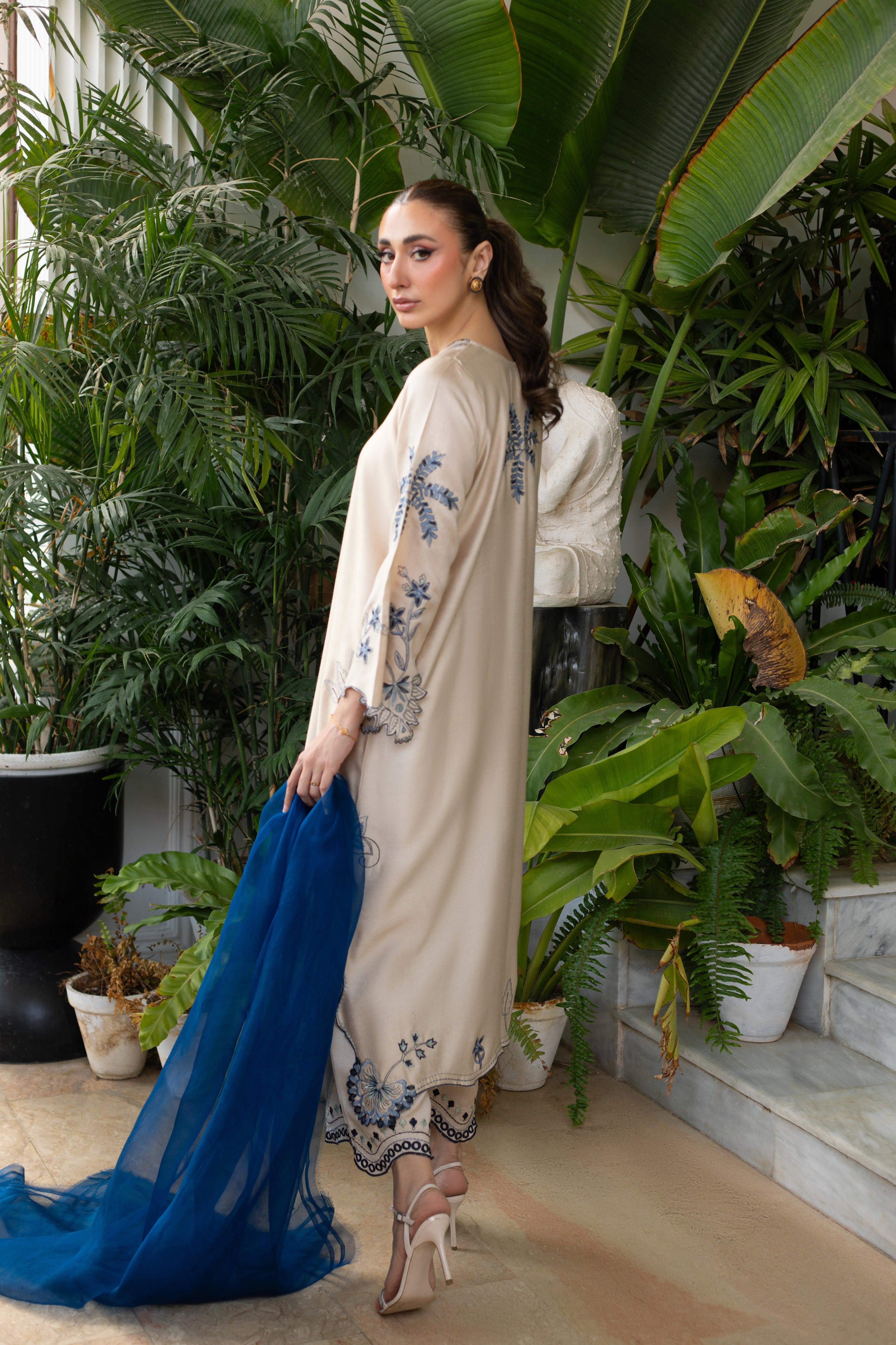 Crafted in luxurious Khaadi silk, this elegant ensemble features a soft blend of white-beige adorned with delicate blue detailing.
