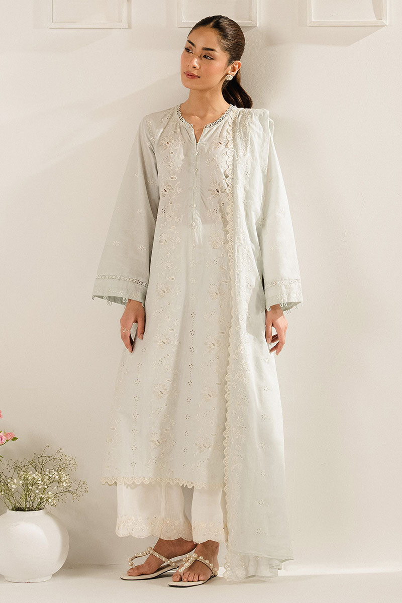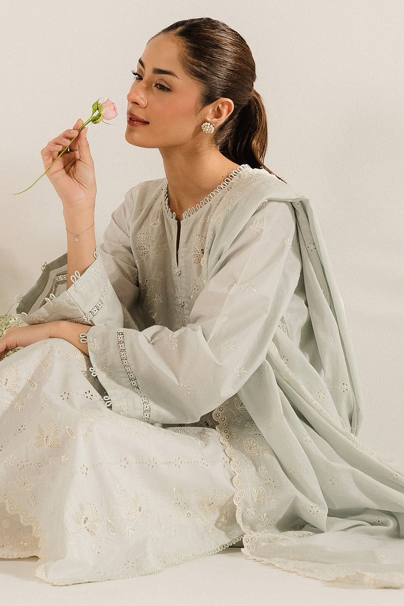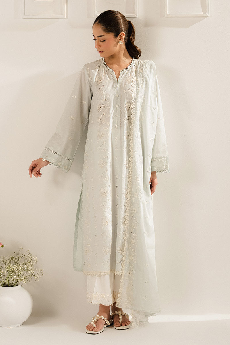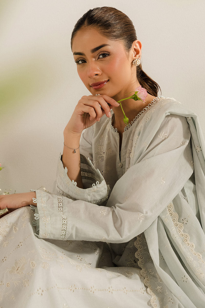 The AZALEA-2PC set includes a beautifully crafted lawn shirt and embroidered dupatta. The straight long shirt features intricate lace and loop details on the front, with a crew neck and flared sleeves. The dyed and embroidered dupatta adds an elegant touch to this set. Perfect for any occasion.