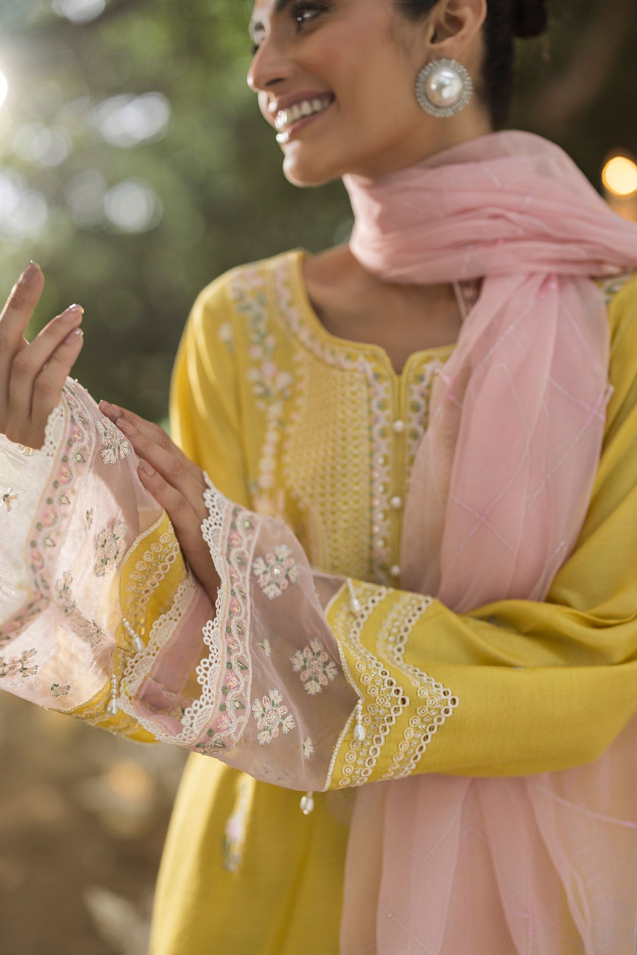 This radiant three-piece ensemble captures the essence of sunshine in a vibrant lemon-yellow hue, bringing a lively charm to any festive occasion. Intricate tonal white and pale pink embroidery graces the neckline and hem, offering a delicate contrast against the bright base. A sheer, flowing powder-pink dupatta lends an ethereal softness, while matching embroidered trousers complete the look with refined cohesion.