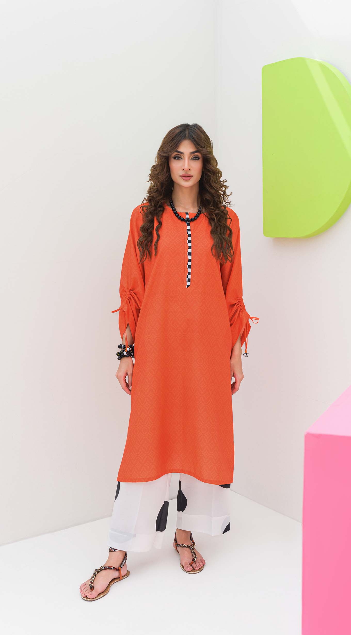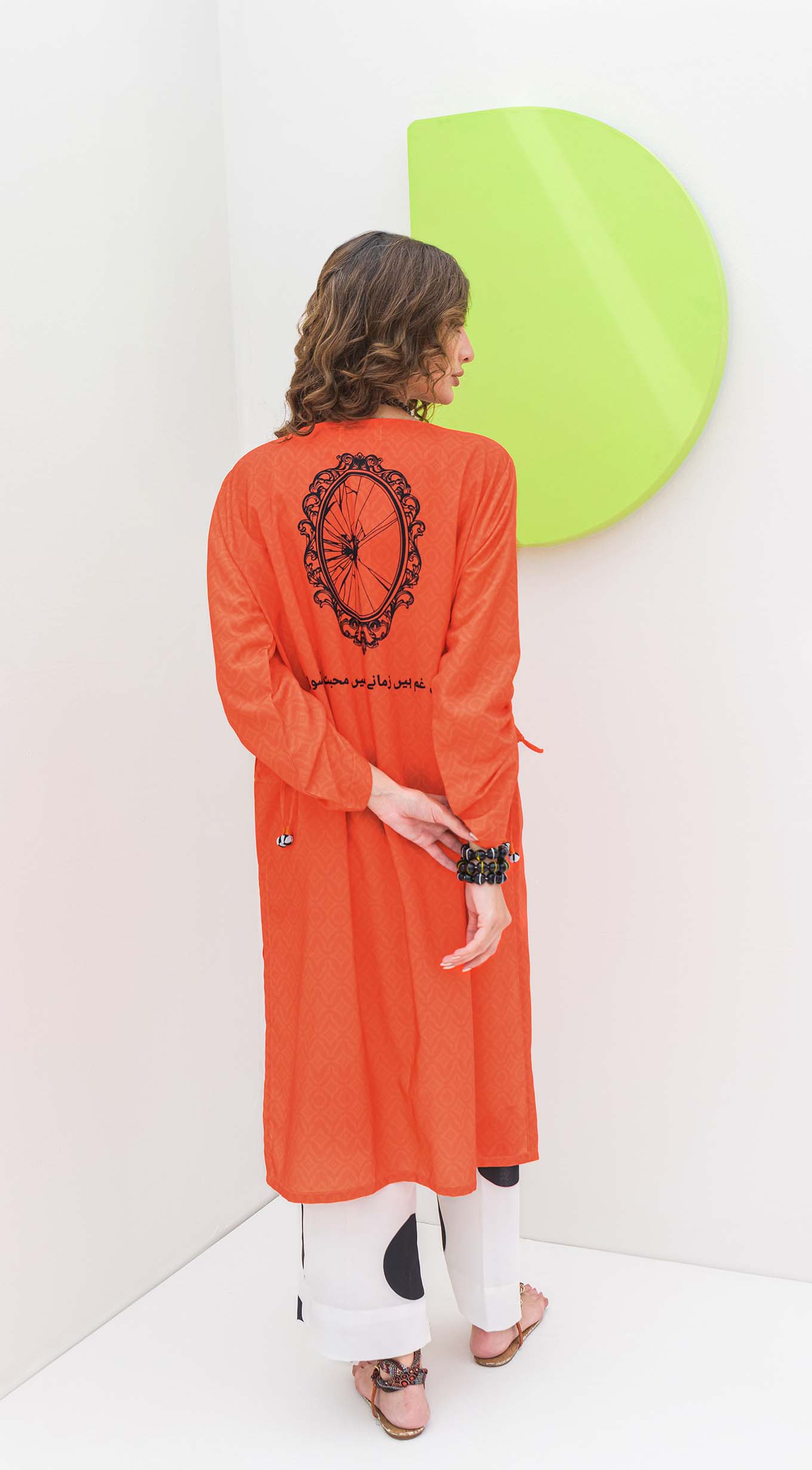 Vibrant orange neon lawn kurta with trendy detailing on the sleeves and striking black and white accents on the neckline. A bold black broken mirror motif adorns the back, complemented by a cool quote for an edgy touch. Paired with chic black and white polka dot trousers, this ensemble is a perfect blend of modern style and comfort. Intricate details and contrasting elements make this outfit a standout piece.
