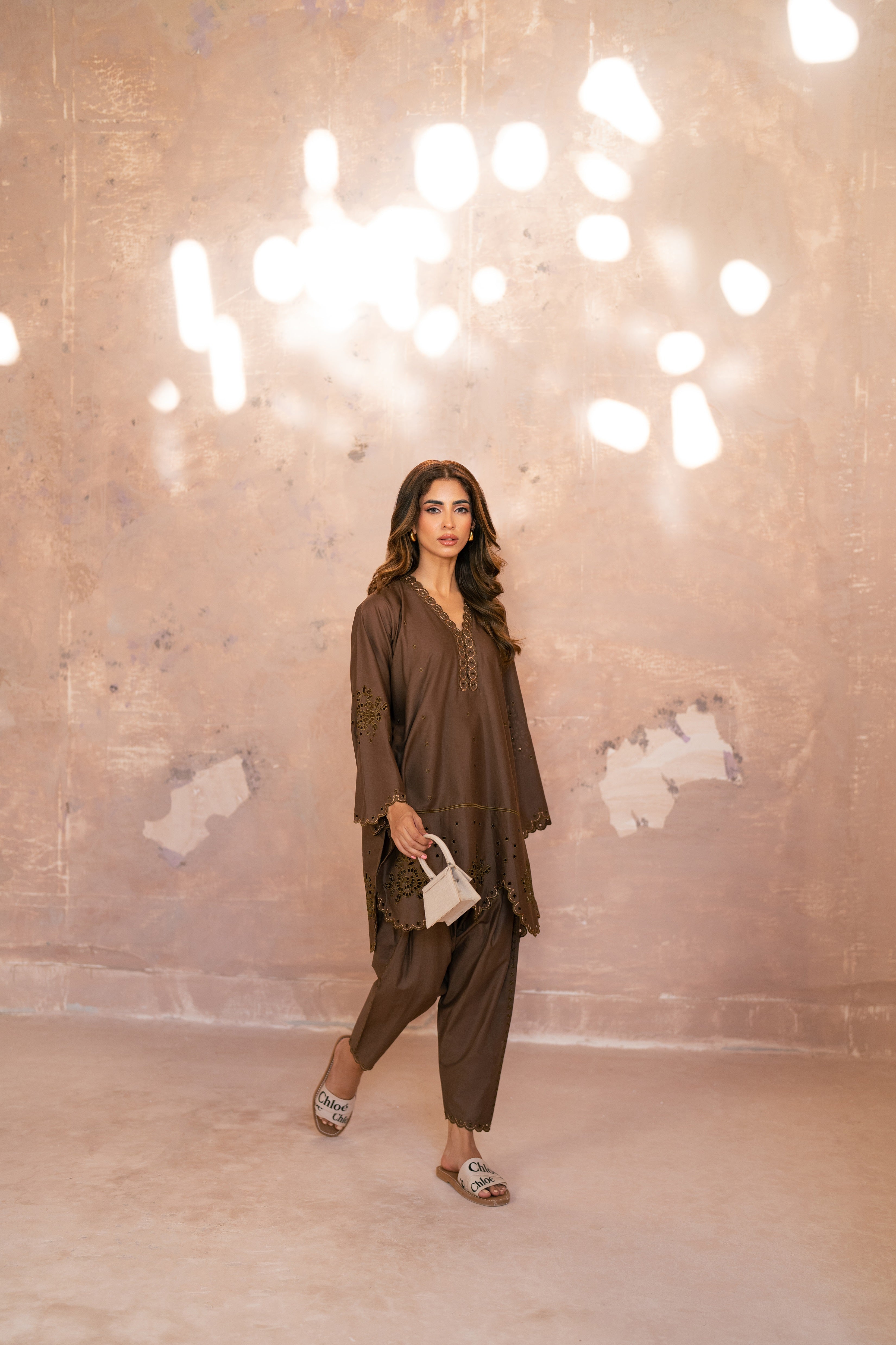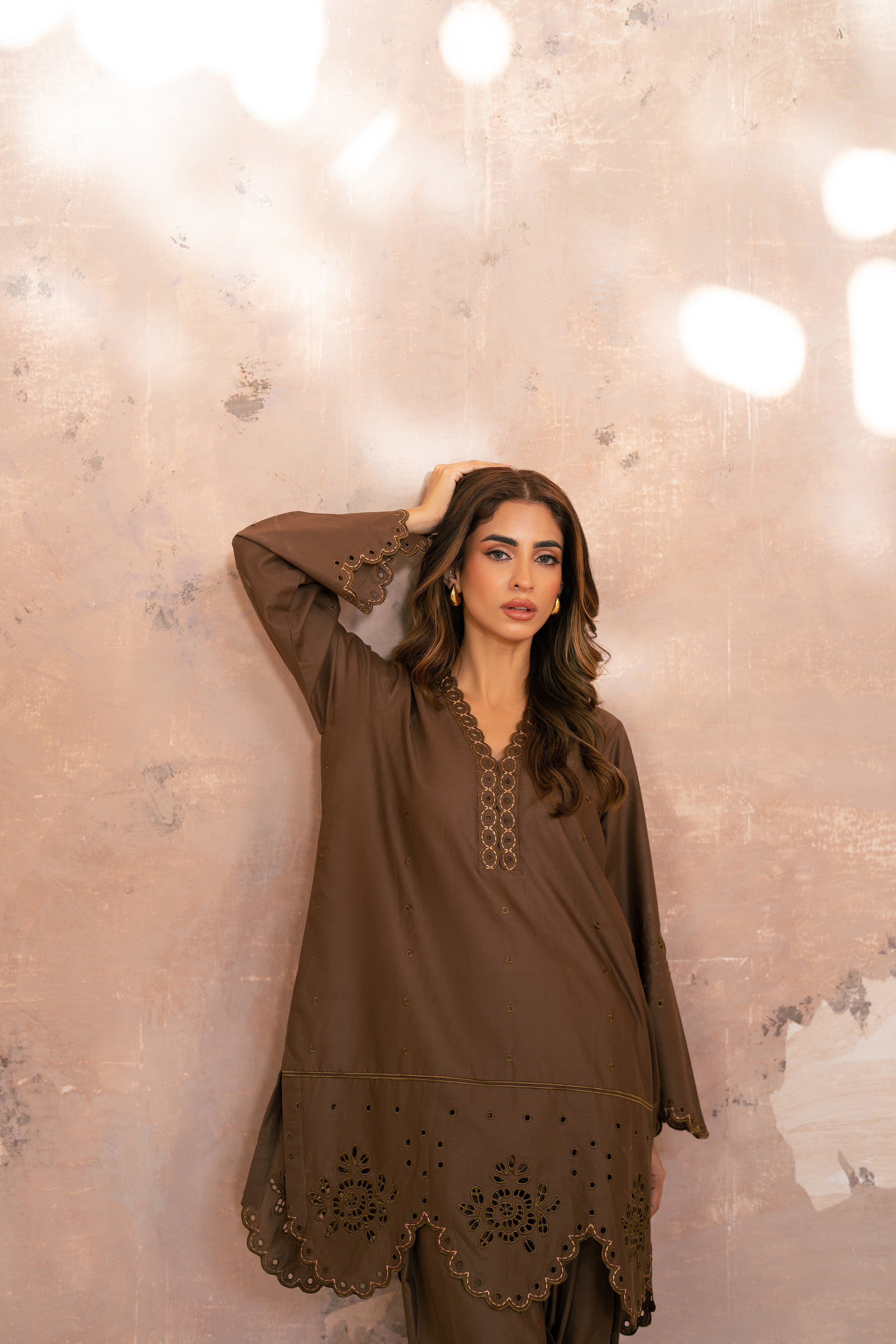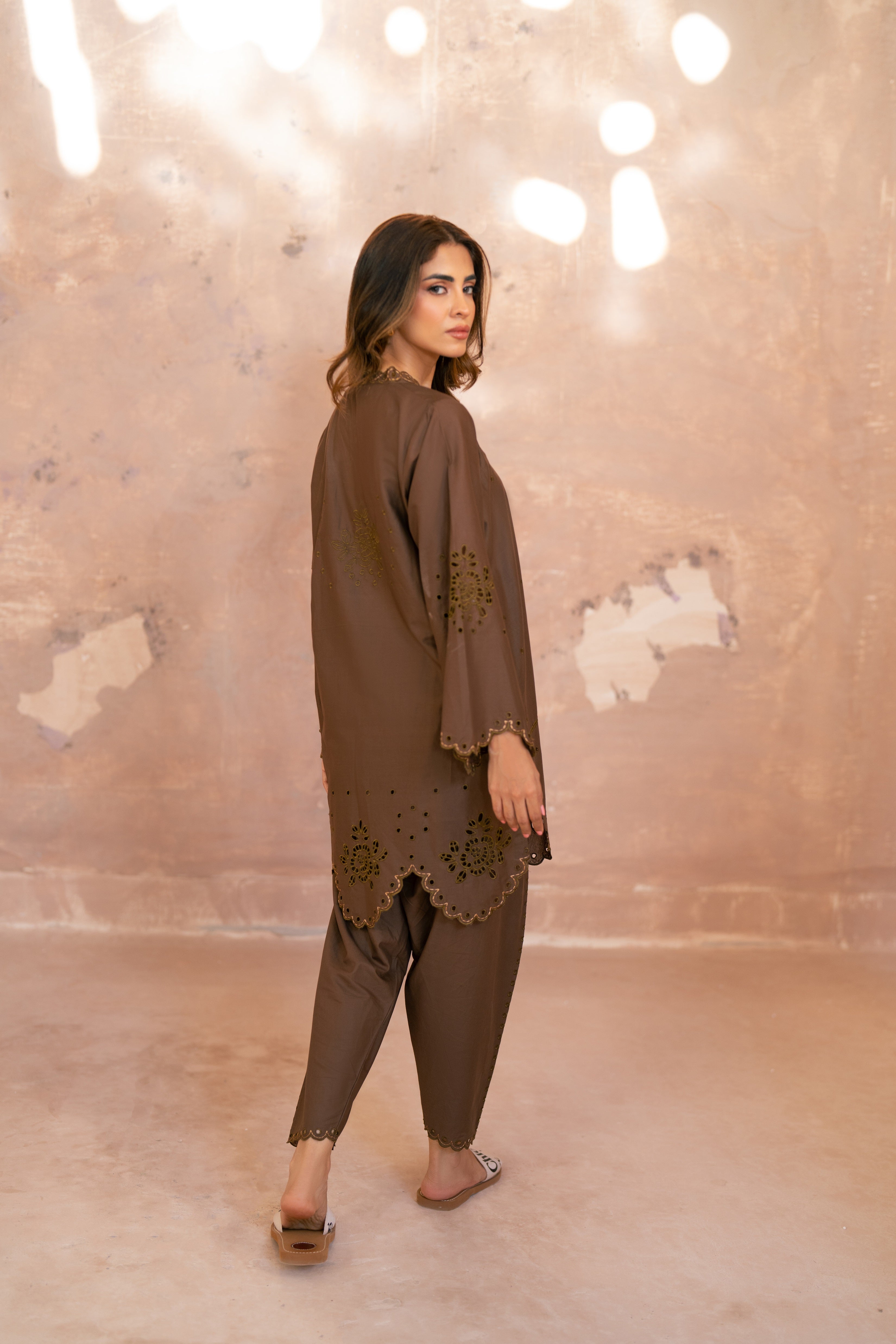 Meticulously crafted with 100% pure cotton. This stunning piece showcases intricate, fully-thread embellishments, adorned with delicate scallop and eyelet details. Completing the ensemble is a matching shalwar, perfect for making a statement.